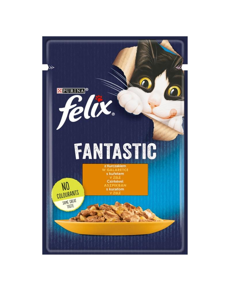 Hrana completă cu pui de jeleu pentru pisici adulte.