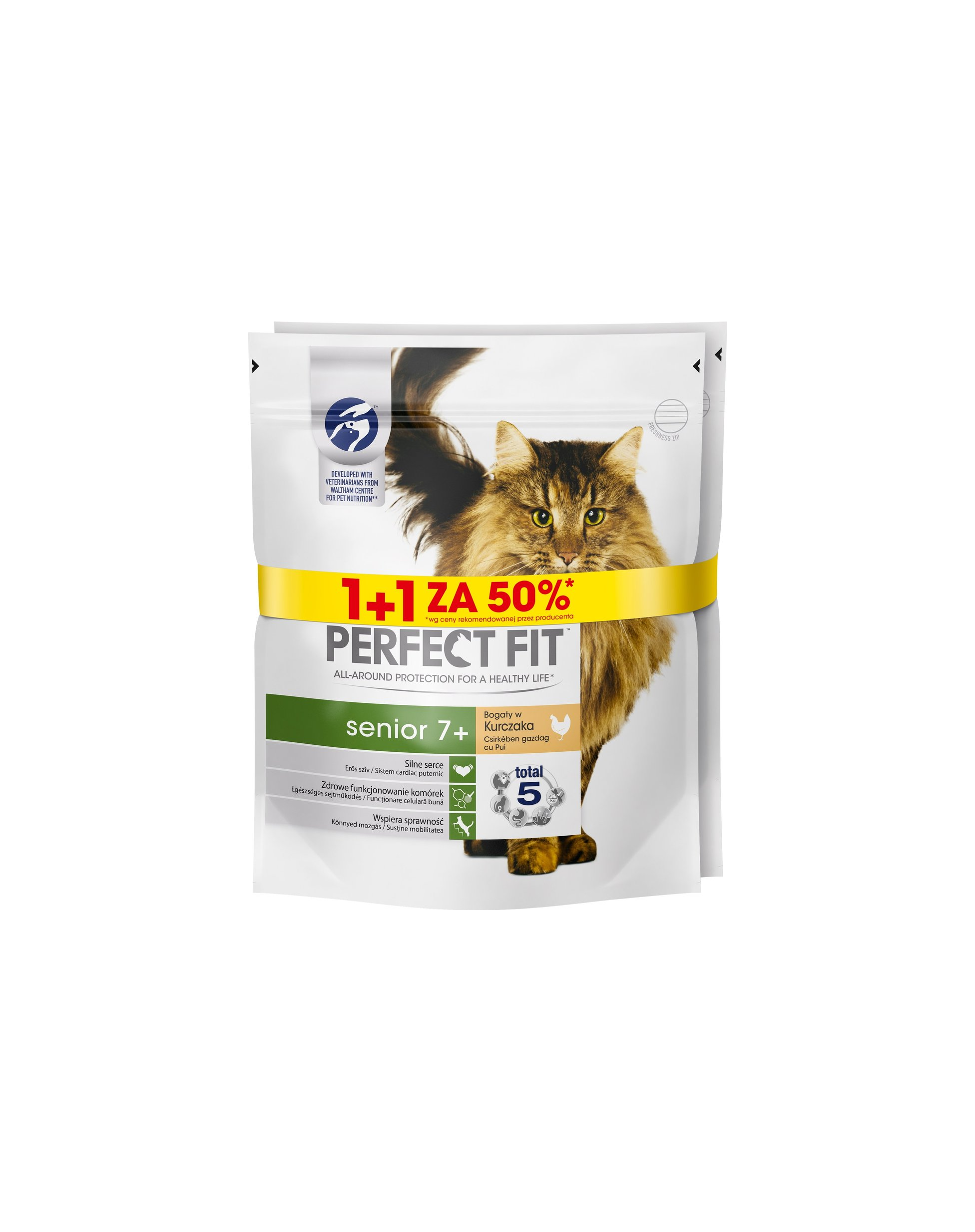 Perfect Fit Senior 7+ a fost dezvoltat cu participarea medicilor veterinari și a specialiștilor în nutriție de la Centrul de nutriție pentru animale de companie WALTHAM. Este o masă delicioasă care include formula unică Total 5, oferindu-i pisicii mai în vârstă protecția sănătății de care are nevoie zilnic. Însă Perfect Fit nu este doar formula Total 5 - varianta bogată în pui oferă 3 beneficii suplimentare legate de sănătatea și stilul de viață al pisicii tale. Cu acest aliment adaptat nevoilor sale specifice, puteți fi sigur că animalul dvs. de companie primește mâncarea potrivită pentru el.
