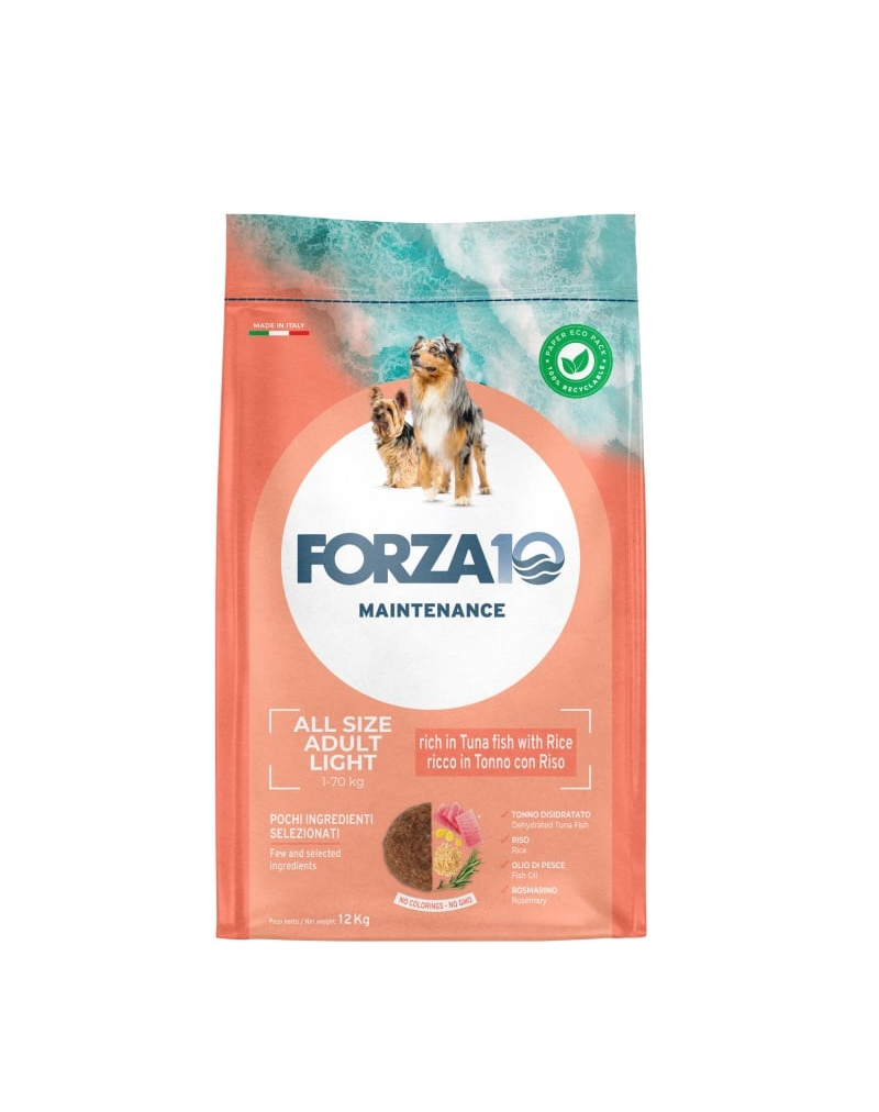 Forza10 Maintenance Light conține ton și orez și este o hrană completă pentru câinii adulți de toate rasele. Carnea de ton este aproape fără grăsimi, iar uleiul de pește și uleiul de porumb sunt benefice pentru blană și piele, precum și pentru buna funcționare a sistemelor cardiovascular și nervos. Conținutul scăzut de grăsimi ajută la controlul nivelului de colesterol. Formula sa a fost dezvoltată pentru câinii mai în vârstă, mai puțin activi sau supraponderali.
