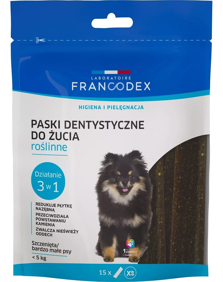 Recompensele Laboratoire Francodex Vegetable Chewing Sticks pentru îndepărtarea tartrului și a mirosului din gură a fost special dezvoltată pentru cele mai mici rase de câini. Dimensiunea potrivită, forma în „Z” și suprafața abrazivă și aspră asigură o curățare mecanică eficientă a dinților. Concentratul de fructe de rodie conținut în formulă reduce formarea plăcii bacteriene, care este responsabilă de mirosul neplăcut. În plus, combinația a două enzime - glucoză oxidază și lactoperoxidază - inhibă dezvoltarea microorganismelor, reducând astfel formarea tartrului. Formula pe bază de plante reduce riscul alergiilor alimentare.
