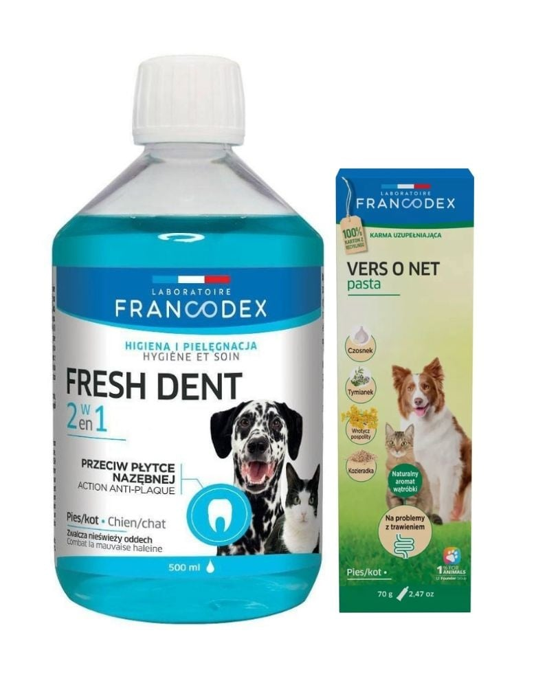 Pachetul conține soluția pentru igiena orală FRANCODEX Fresh Dent 500 ml și pastă pentru probleme digestive 70 g, oferită gratuit. Produsele sunt destinate câinilor și pisicilor și pot fi utilizate ca parte a rutinei zilnice de îngrijire.
