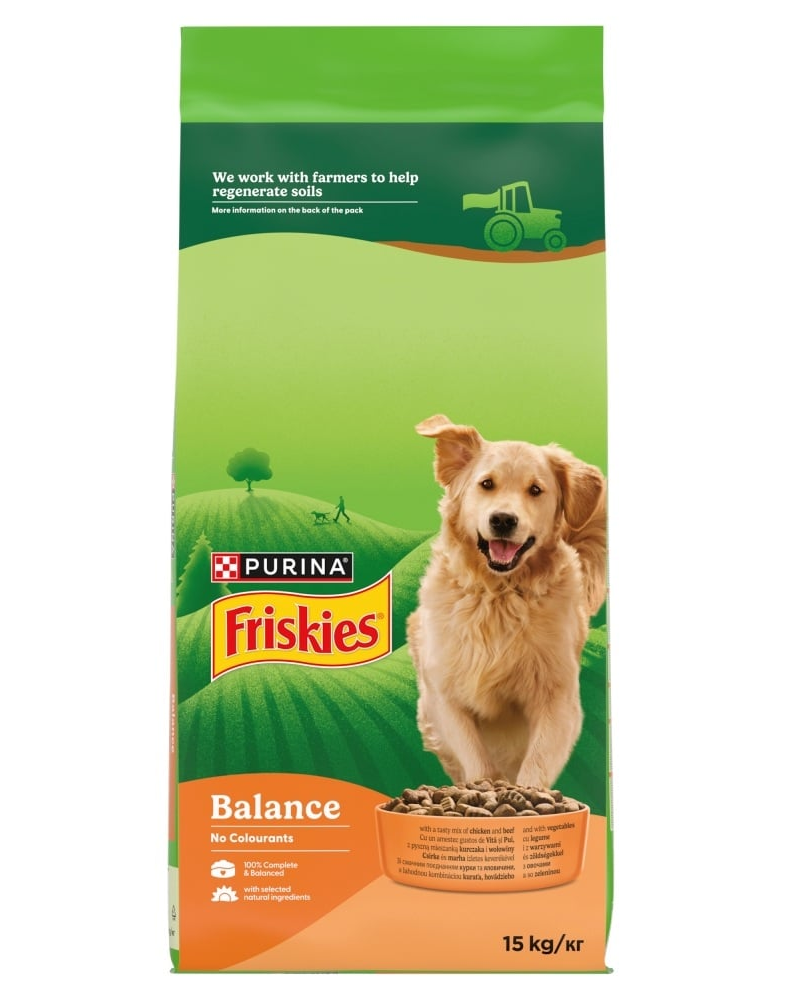 Friskies Balance este o hrană uscată completă pentru câini adulți, formulată pentru a susține alimentația zilnică și menținerea unei stări generale bune.