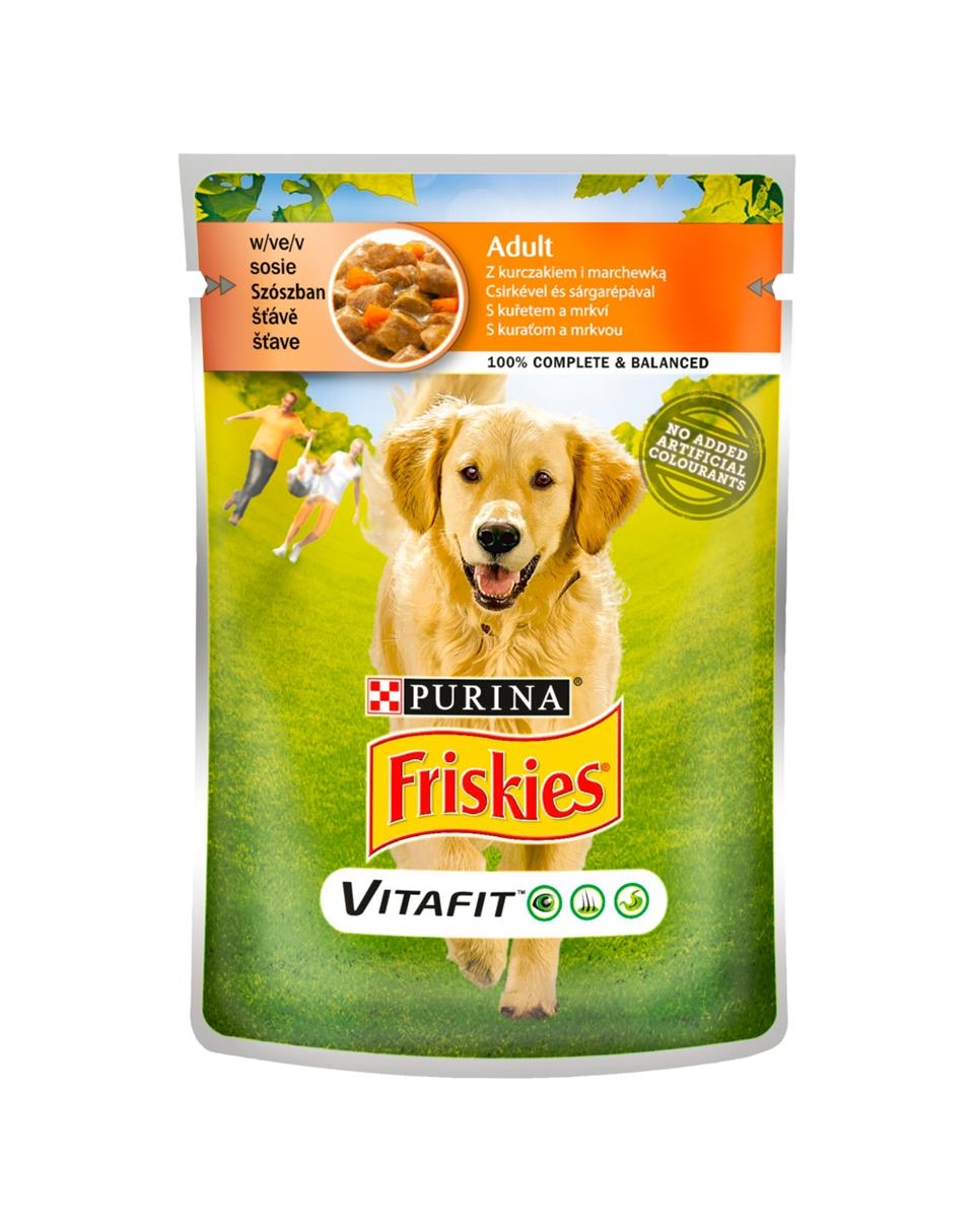 Purina Friskies Adult Vital cu pui și morcov în sos închis în pliculețe practice susține sănătatea câinelui dumneavoastră. Asigură vitalitatea animalelor: scaune compacte datorită unei digestii sănătoase, blană strălucitoare și piele sănătoasă, strălucire în ochi - semn de vigilență. Furnizează toate vitaminele și nutrienții necesari pentru a vă menține animalul de companie în condiții optime. Fără adaos de coloranți, arome sau conservanți artificiali.