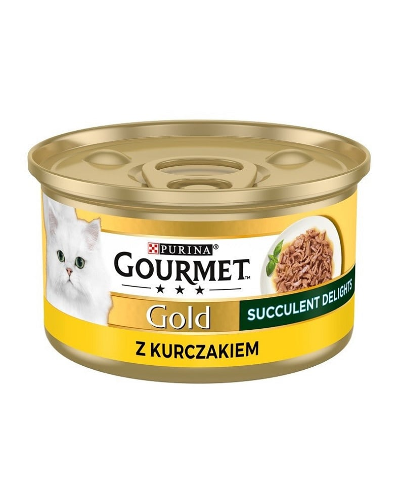 Hrană umedă pentru pisici adulte, cu textură suculentă. Gourmet Gold Succulent Delights este o hrană umedă completă pentru pisici adulte, preparată sub formă de bucăți fragede în sos, pentru o masă gustoasă și ușor de consumat.