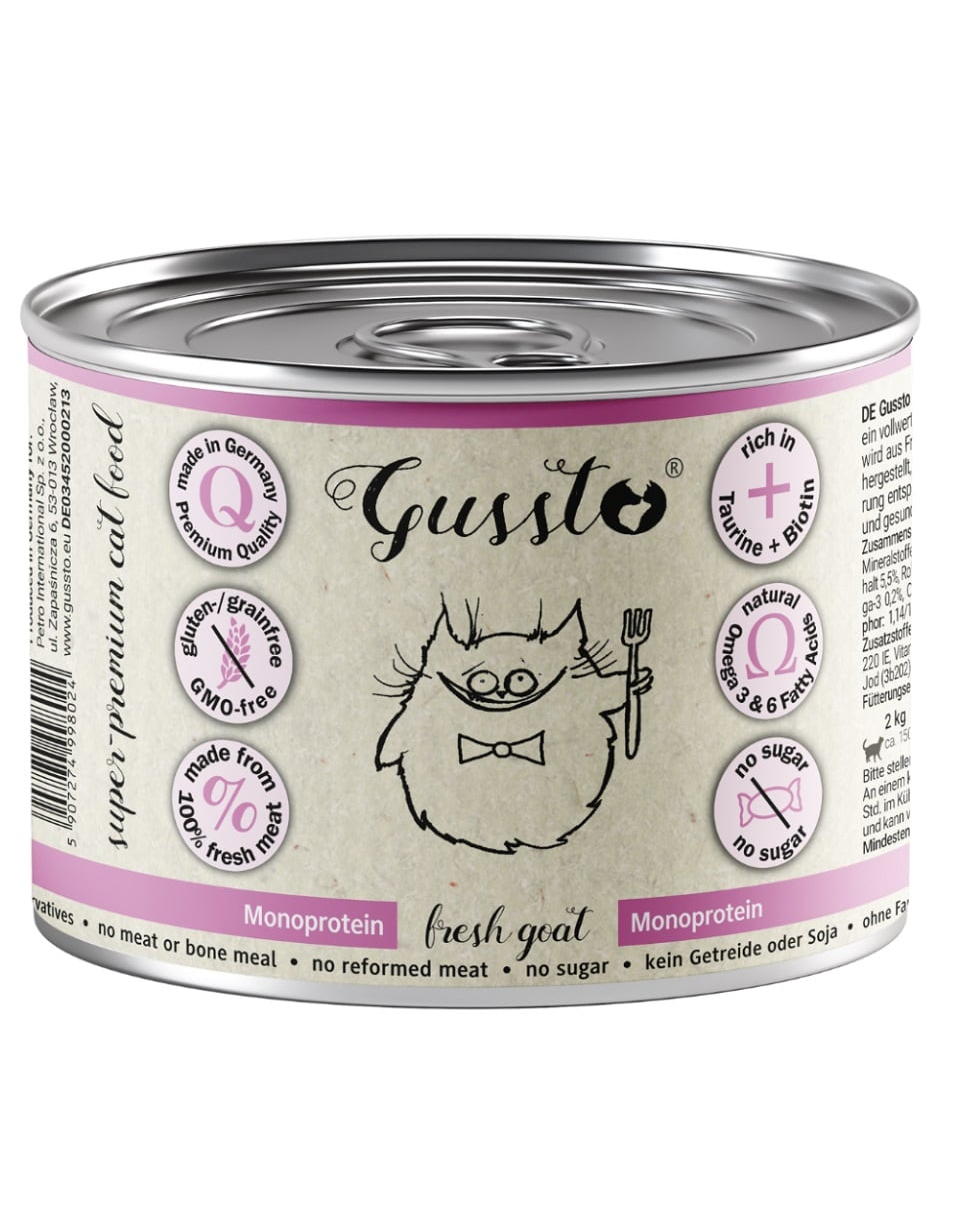 Rețeta este îmbogățită cu un complex de vitamine și minerale esențiale, taurina necesară pentru sănătatea inimii și a vederii, biotină pentru blană strălucitoare și ulei de armurariu – o sursă naturală de acizi grași nesaturați cu efect antiinflamator. Astfel, GUSSTO Fresh Goat sprijină funcțiile ficatului, digestia, imunitatea și menține pisica plină de vitalitate.