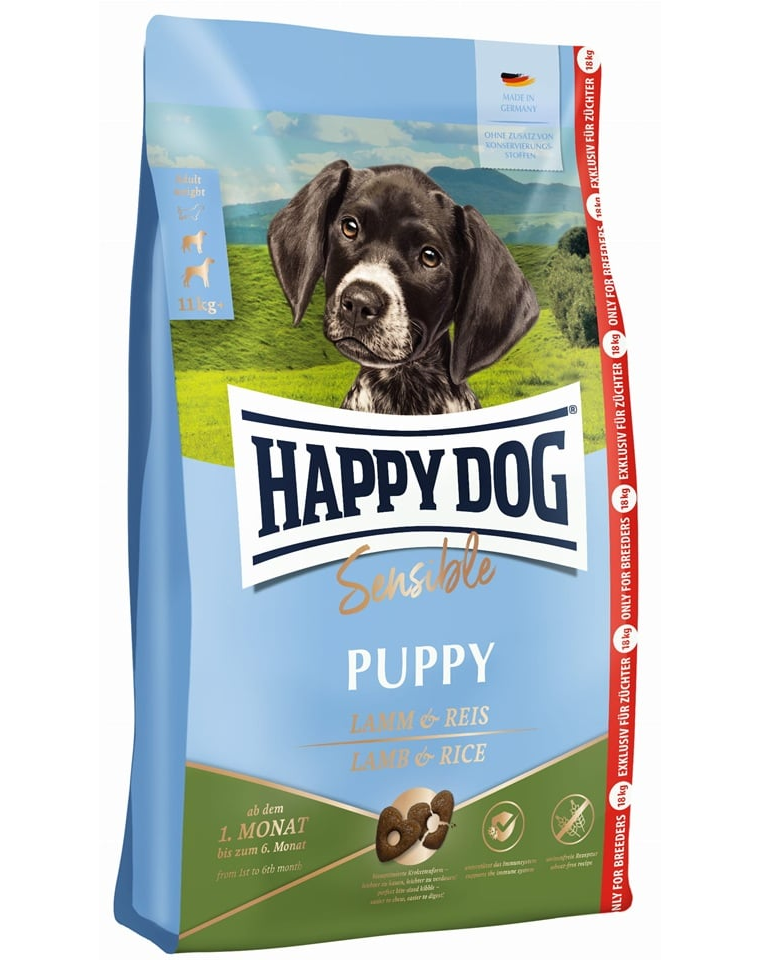 Happy Dog Profi Sensible Puppy este o hrană uscată completă, formulată pentru căței aflați în perioada de creștere intensă, cu vârste între 1 și 6 luni.