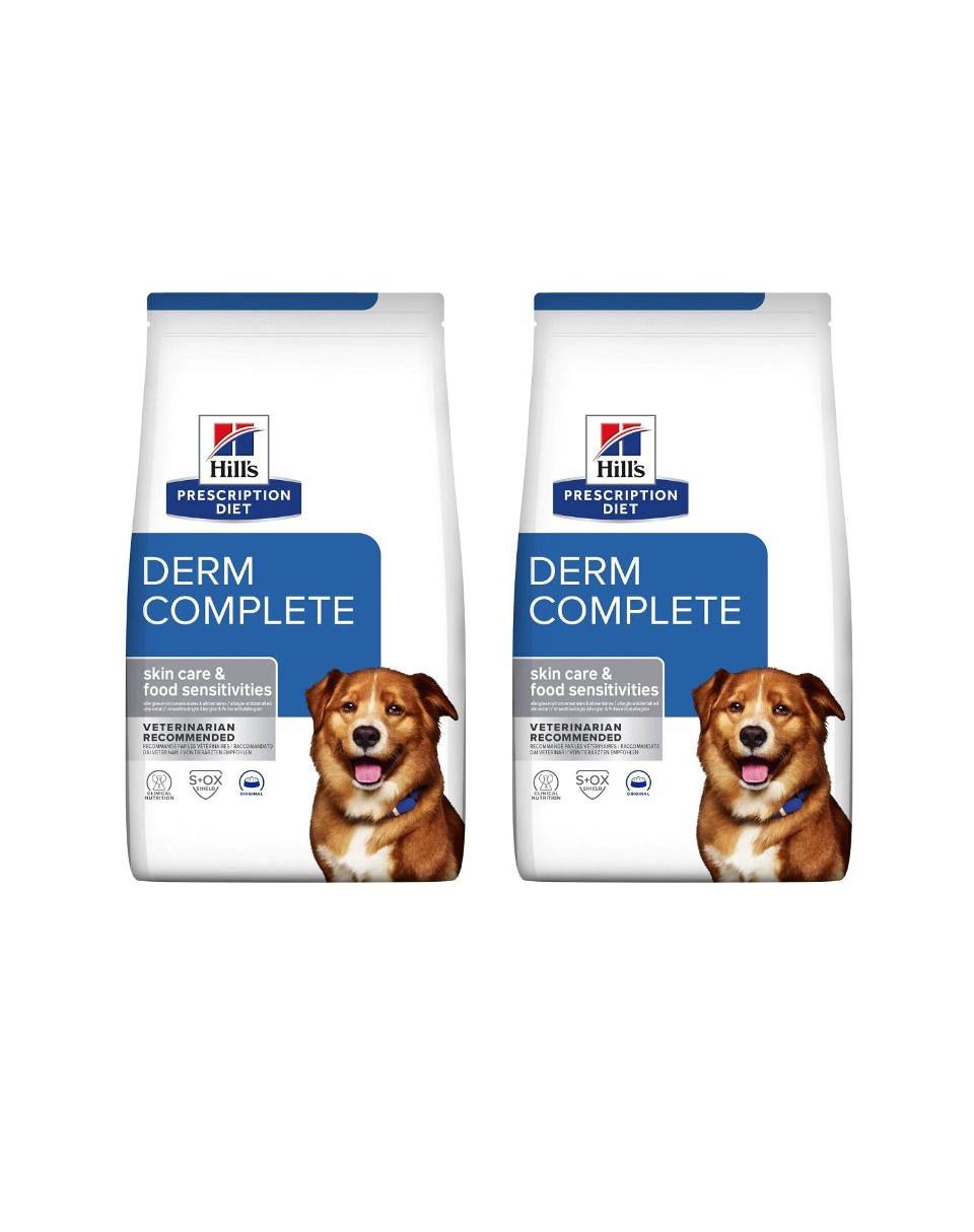 Hrana pentru câini Hill's PRESCRIPTION DIET Derm Complete este o hrană dietetică completă pentru susținerea sănătății pielii în caz de boli de piele și pierdere excesivă a părului, precum și pentru reducerea simptomelor de intoleranță la alimente și componente nutritive la câinii adulți. Acest aliment are un conținut ridicat de acid linoleic (LA) și un conținut combinat de acid eicosapentaenoic (EPA) și acid docosahexaenoic (DHA), precum și surse selecționate și limitate de proteine și carbohidrați.