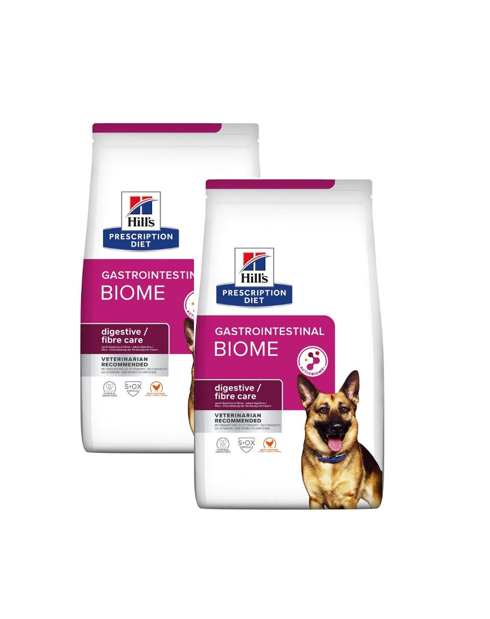Hrana pentru câini Hill's PRESCRIPTION DIET Gastrointestinal Biome cu pui este o hrană dietetică completă, foarte digerabilă, care ajută la reducerea simptomelor de malabsorbție intestinală și compensează efectele unei digestii deficitare la câinii adulți. Această hrană îmbogățită cu fibre are un conținut crescut de sodiu și potasiu și conține ingrediente foarte ușor de digerat.