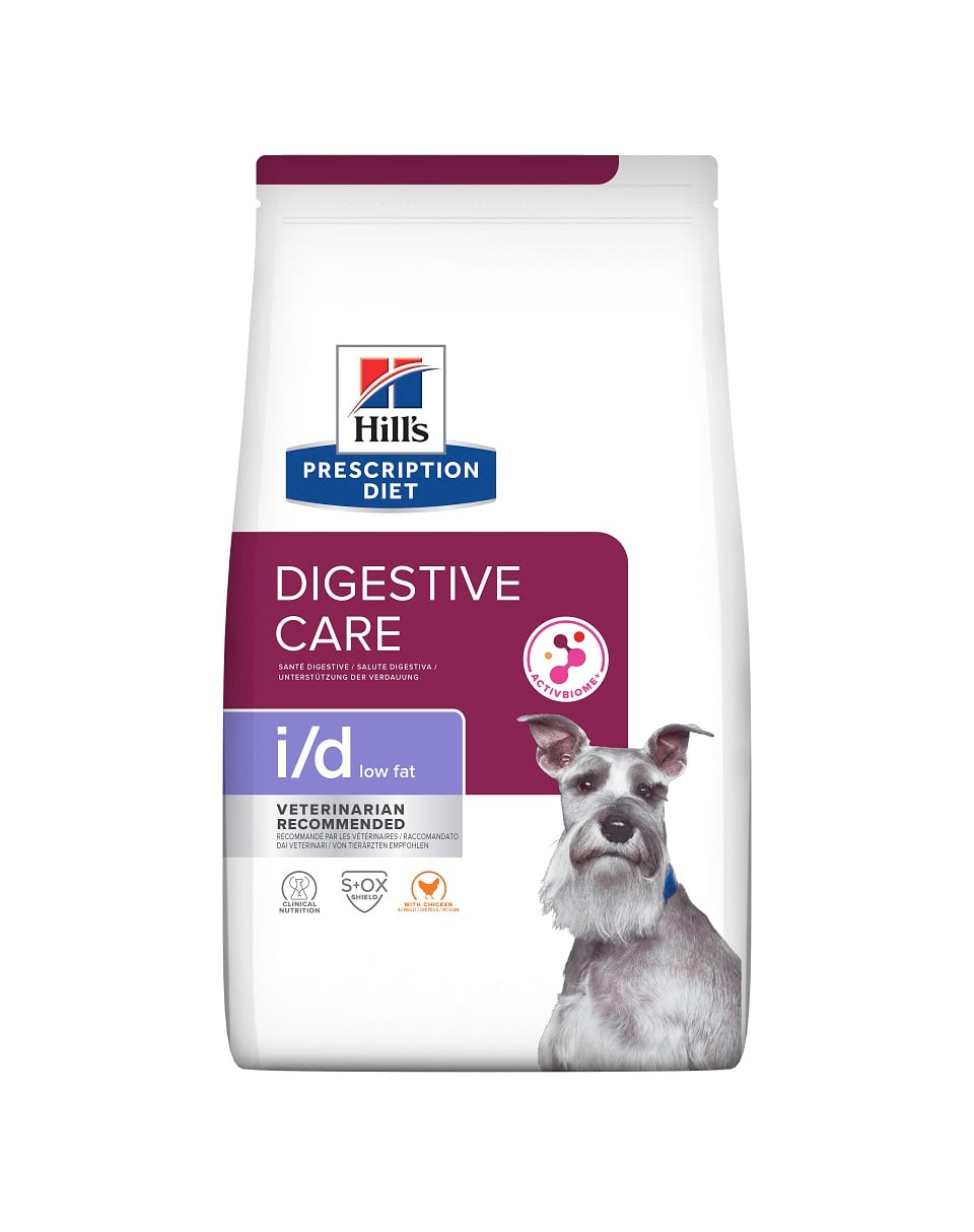 HILL’S Prescription Diet Canine i/d Low Fat Digestive Care cu pui este o hrană dietetică completă, uscată, formulată de nutriționiști și medici veterinari Hill’s pentru câinii cu sistem digestiv sensibil. Rețeta cu conținut redus de grăsimi și ingrediente ușor digerabile susține funcționarea normală a tractului gastrointestinal și contribuie la o digestie mai bună.