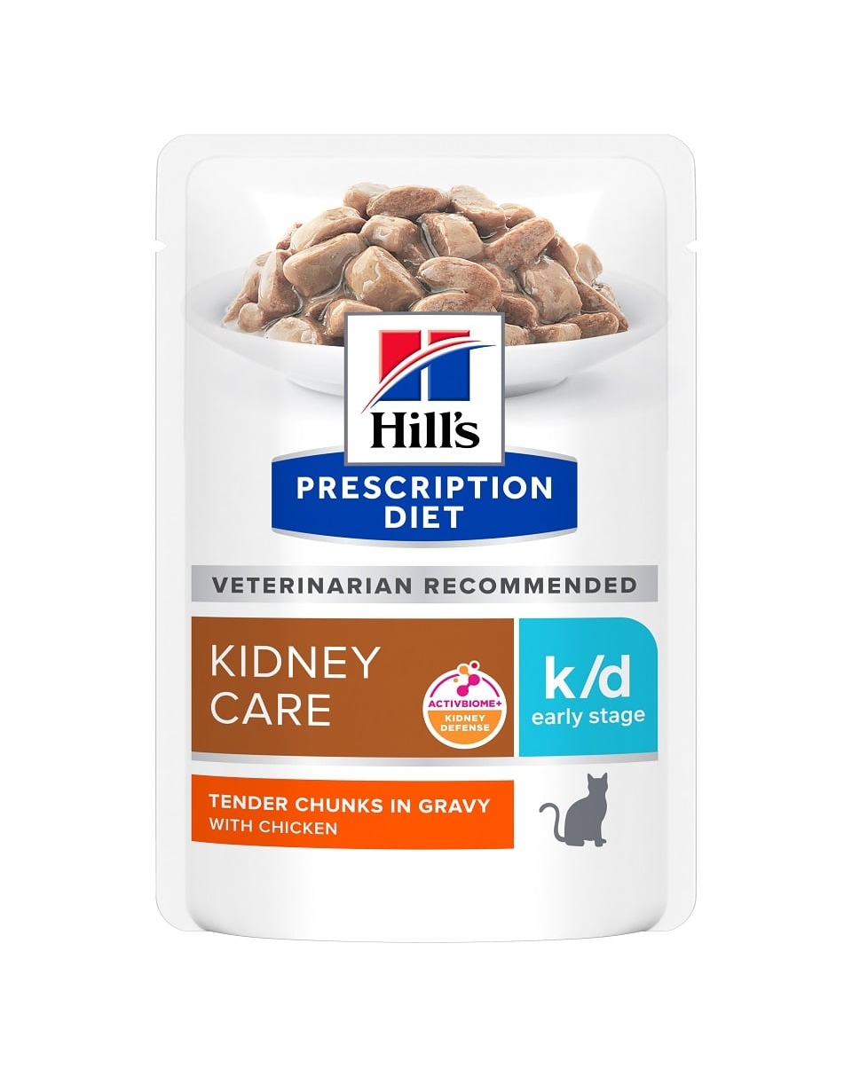 Hill's Prescription Diet k/d Early Stage este o hrană clinică pentru pisici, concepută pentru a proteja funcțiile esențiale ale rinichilor. Rețeta include ActivBiome+ Kidney Defense, o combinație unică de prebiotice cu eficiență dovedită clinic, ce hrănesc microbiomul intestinal și sprijină funcționarea rinichilor. Preparată cu pui gustos, această hrană are un gust plăcut pe care pisicile îl acceptă cu ușurință.