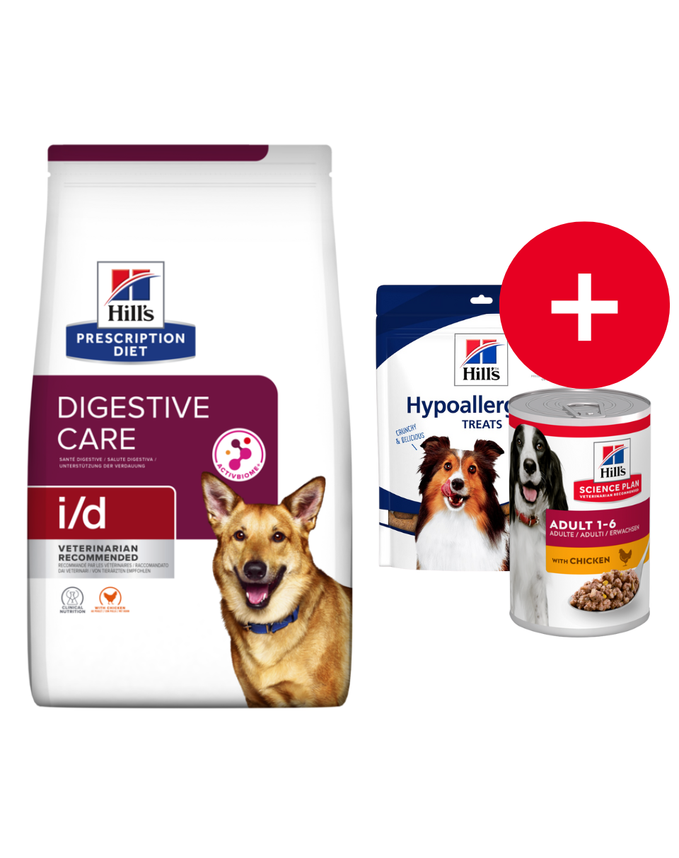 Hrana uscată pentru câini Hill's Prescription Diet i/d este special formulată pentru a ameliora tulburările digestive și răspunde nevoilor nutriționale speciale ale cățeilor și câinilor adulți.