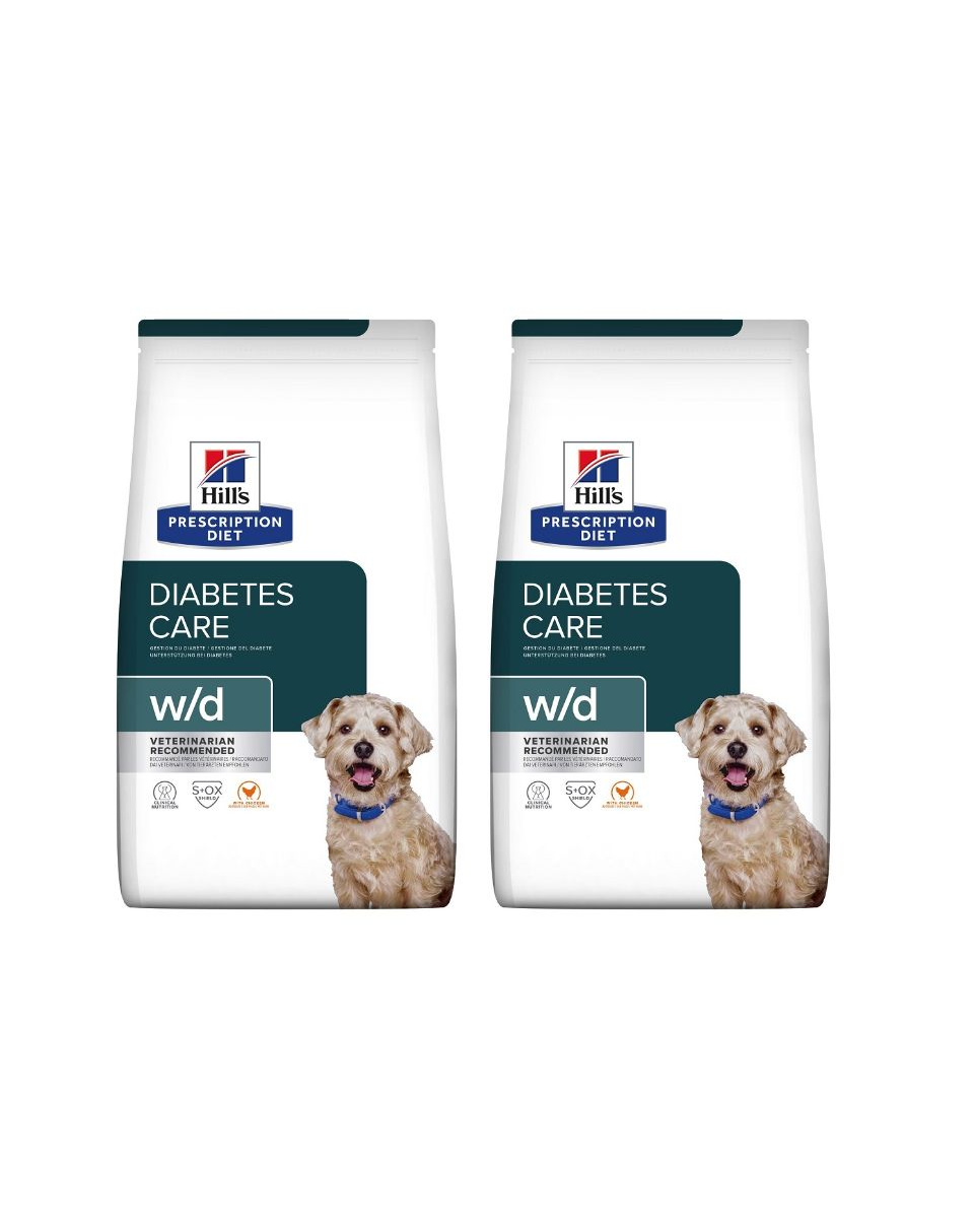 Hill's Prescription Diet w/d cu o formulă unică pentru a ajuta la controlul nivelului de glucoză al câinelui dumneavoastră. Combinația optimă de fibre solubile și insolubile din dieta w/d, cu un conținut scăzut de carbohidrați, ajută la reglarea nivelului de glucoză din sânge și la menținerea unei greutăți corporale sănătoase.