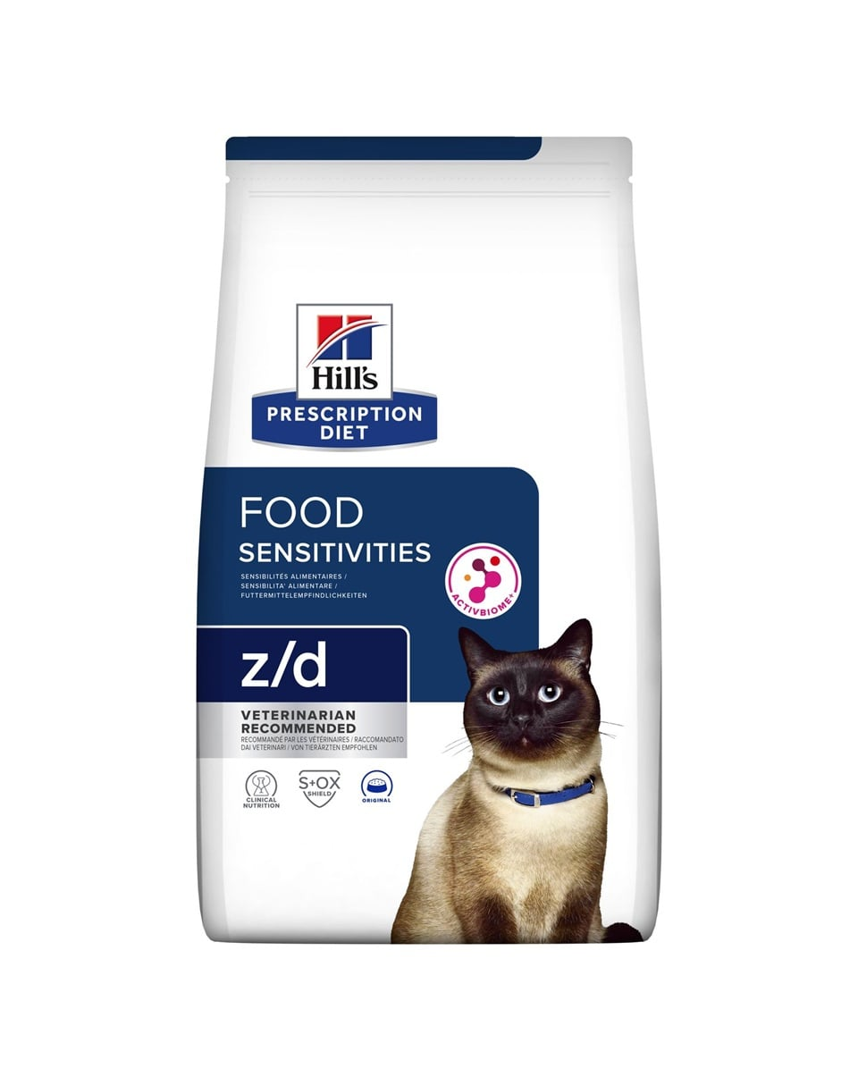 Hill's PRESCRIPTION DIET z/d este o hrană uscată completă, dietetică, elaborată special pentru pisicile adulte care suferă de intoleranțe sau hipersensibilități alimentare.