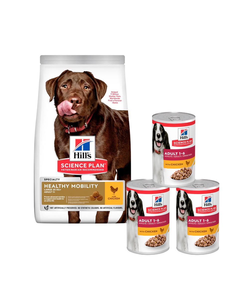 HILL'S SCIENCE PLAN Healthy Mobility Hrană pentru câini adulți de talie mare cu pui este special concepută pentru a susține sănătatea articulațiilor pentru un stil de viață activ.