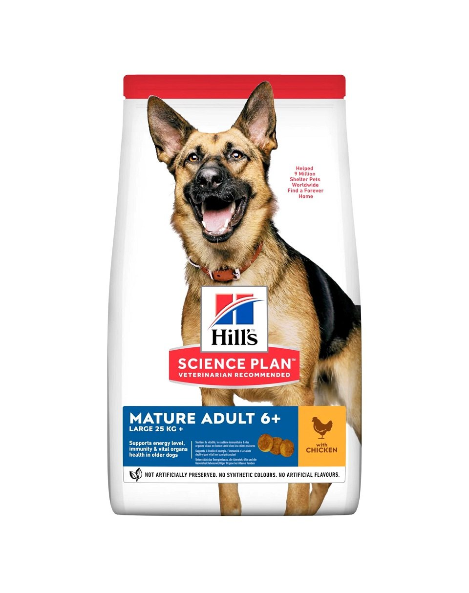 HILL'S SCIENCE PLAN Large Breed Mature Adult hrană pentru câini adulți cu pui a fost dezvoltată pentru a răspunde nevoilor speciale ale câinilor de talie mare care îmbătrânesc. ▸ Oferă o nutriție ușor de digerat cu o combinație sinergică de ingrediente pentru a susține energia și nivelul de activitate.