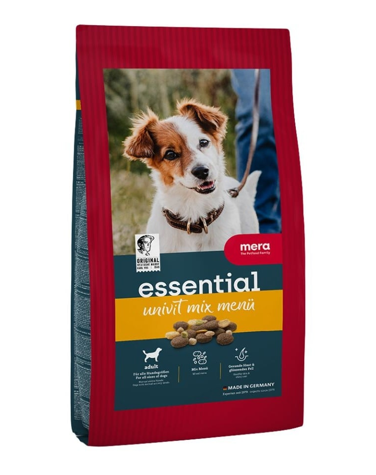 Hrana pentru câini adulți mix meniu MERA Essential Univit Mix Menu este potrivită pentru câinii de toate rasele care au un nivel normal de activitate și au nevoie de o alimentație variată și gustoasă. Este alegerea potrivită dacă câinele tău se plictisește ușor de hrana standard și ai nevoie de o formulă mai atractivă.
