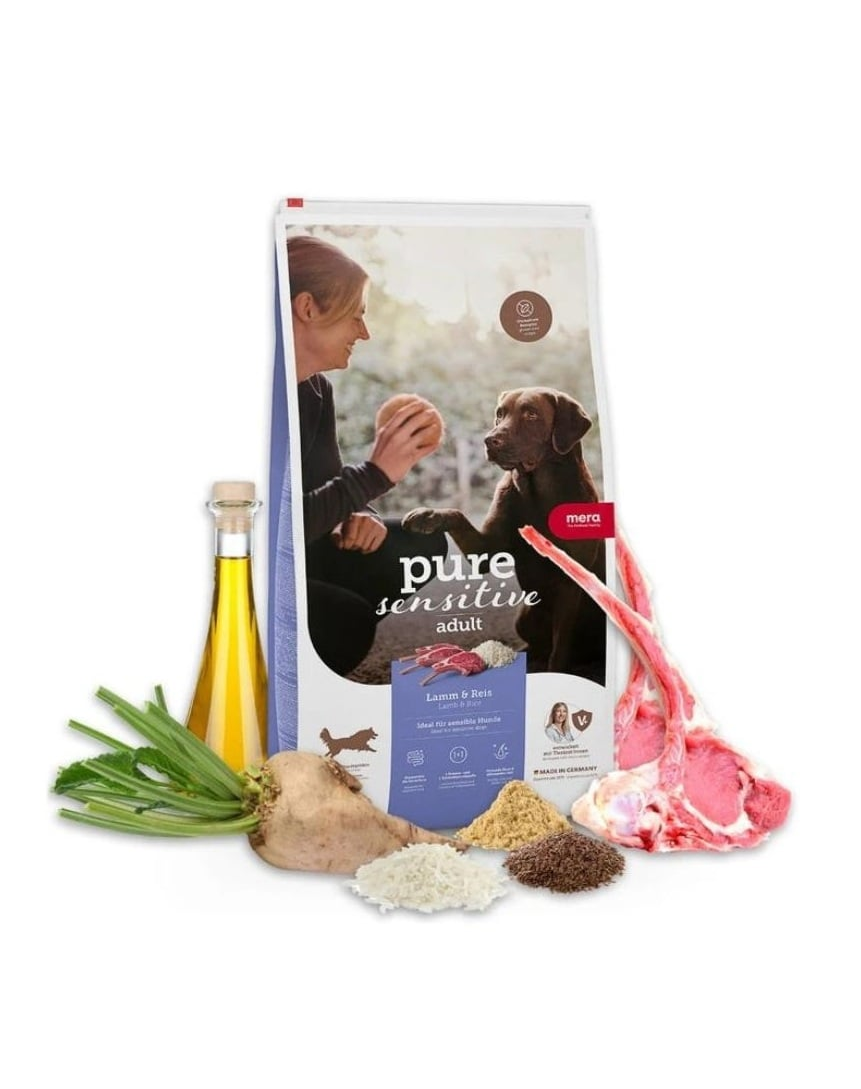 Hrana pentru câini sensibili miel orez MERA Pure Sensitive este destinată câinilor adulți care au digestie sensibilă sau reacționează la proteinele comune precum puiul. Este o alegere potrivită dacă observi intoleranțe alimentare sau ai nevoie de o formulă simplă, bine tolerată, pentru alimentația zilnică.