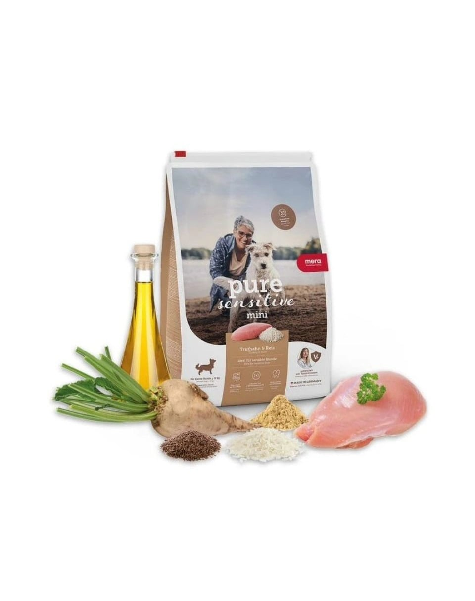 Hrana pentru câini talie mică sensibili MERA Pure Sensitive Mini Curcan & Orez este concepută pentru câinii adulți de talie mică care au digestie sensibilă sau reacționează ușor la schimbări alimentare. Este o alegere potrivită dacă observi scaune moi, intoleranțe sau sensibilitate digestivă și ai nevoie de o hrană simplă, ușor de tolerat.