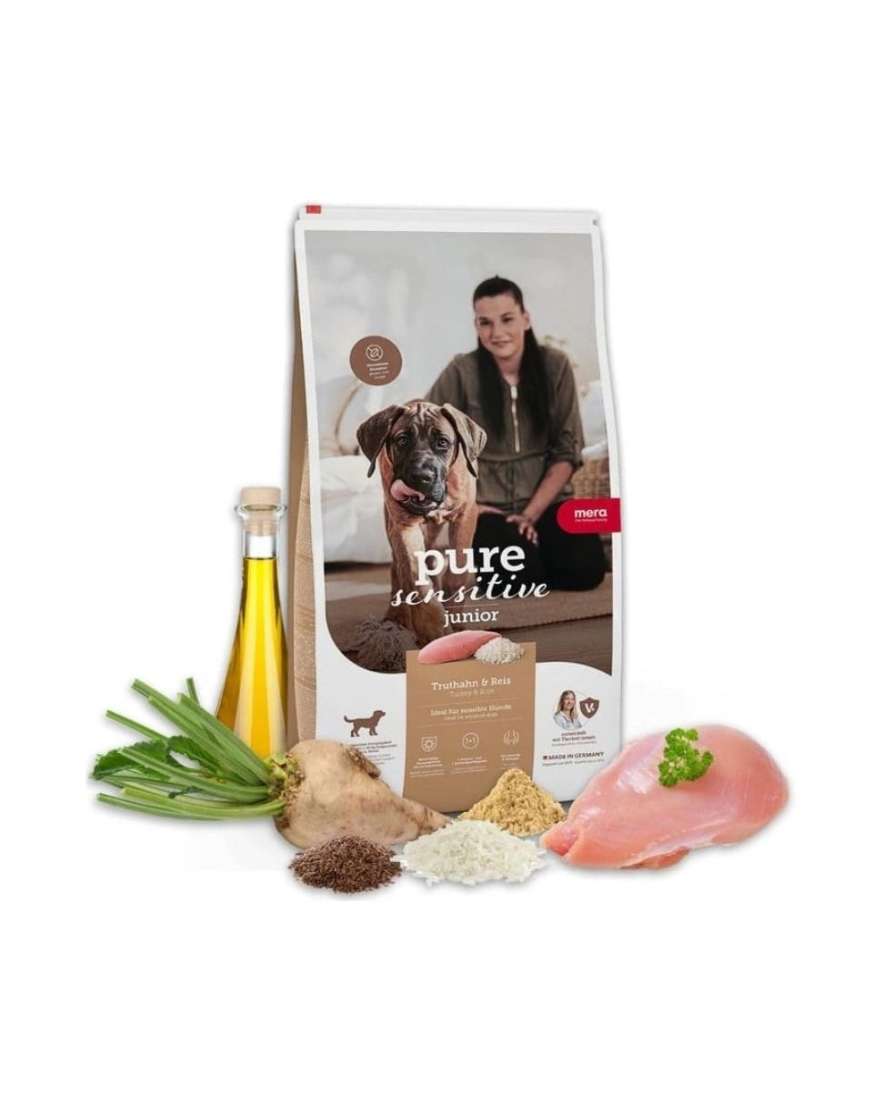 Hrana pentru căței sensibili curcan MERA Pure Sensitive Junior este concepută pentru câinii tineri care au digestie sensibilă și au nevoie de un start sigur în alimentație. Este potrivită pentru căței de la 6 luni care pot reacționa la formule complexe și au nevoie de o hrană simplă, bine tolerată.