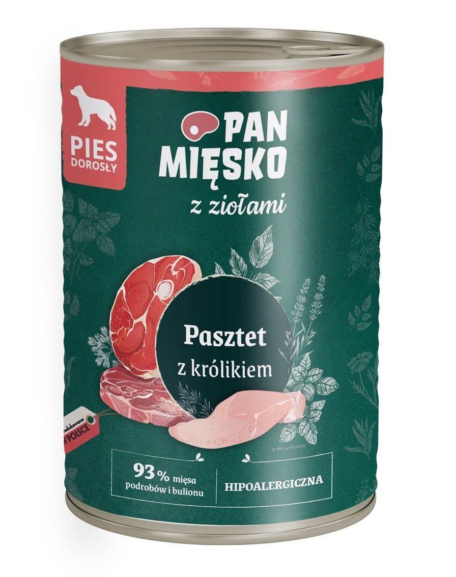 PAN MIĘSKO pate de iepure este o hrană umedă completă pentru câini adulți, formulată pentru digestie ușoară și toleranță ridicată. Rețeta este potrivită pentru câini cu sensibilități alimentare, oferind un aport echilibrat de nutrienți esențiali.
