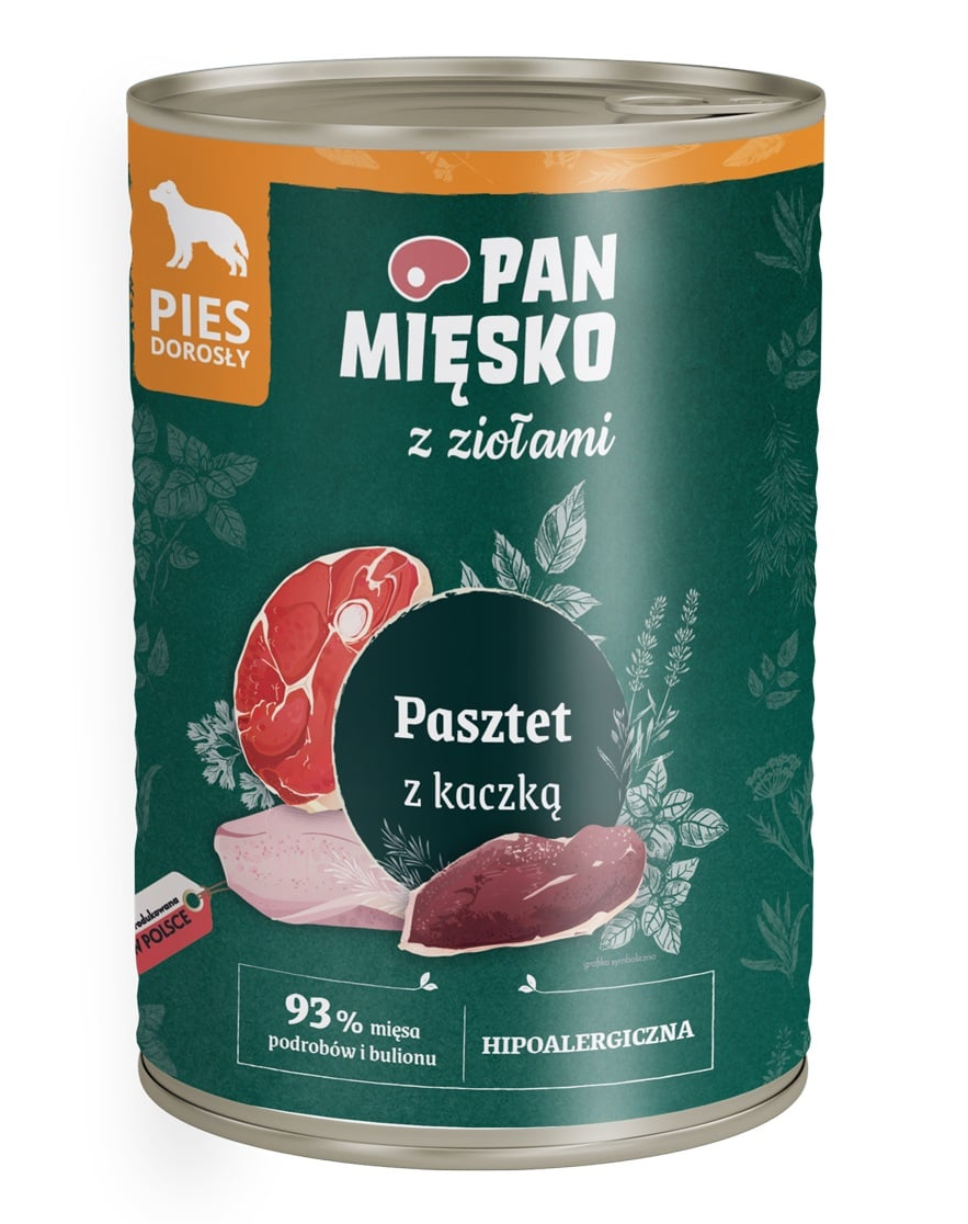 PAN MIĘSKO pate de rață este o hrană umedă completă pentru câini adulți, formulată pentru digestie ușoară și toleranță ridicată. Rețeta este bazată pe ingrediente de origine animală și plante funcționale, fiind potrivită pentru câini cu sensibilități alimentare.