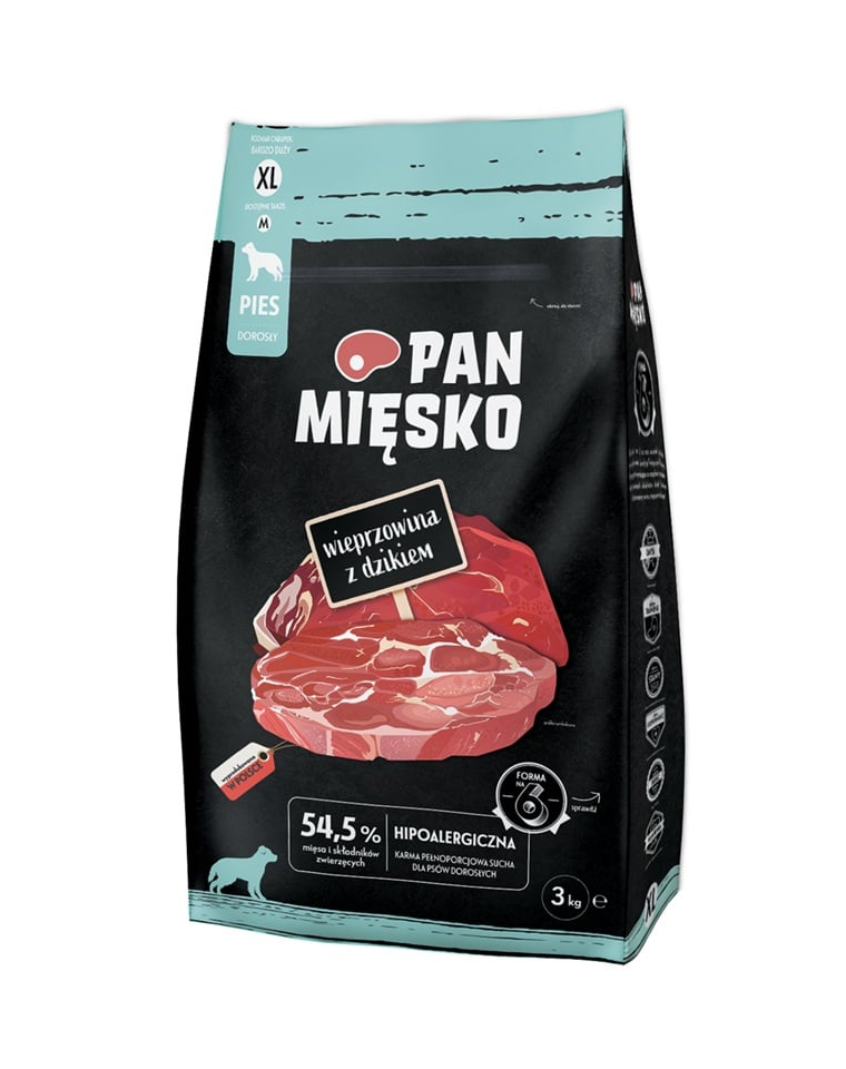 PAN MIĘSKO porc cu mistreț este o hrană uscată completă pentru câini adulți, formulată pentru susținerea digestiei și reducerea riscului de reacții alimentare. Rețeta conține proteine atent selecționate și ingrediente ușor digerabile, potrivite pentru câini cu sensibilități alimentare.
