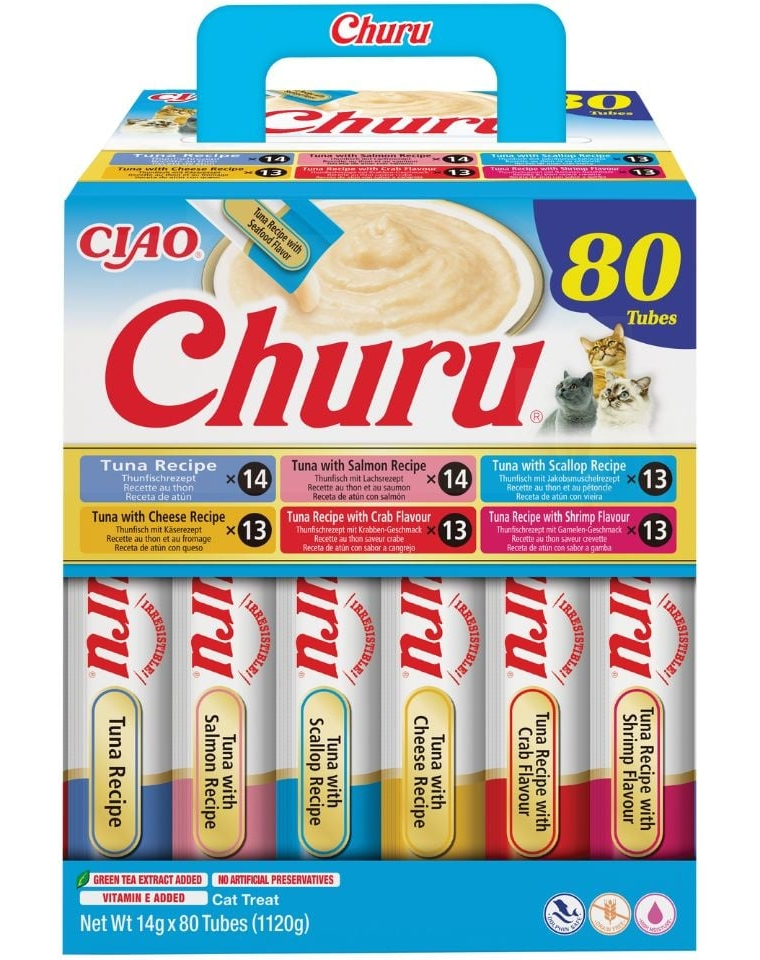 În ambalaj se află 80 de plicuri Churu, în șase variante de aromă: