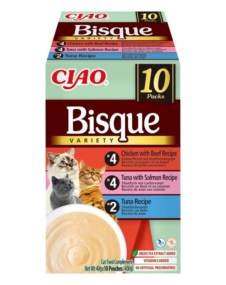 INABA Cat Ciao Bisque Variety este o serie de supe cremă extrem de delicate pentru pisici, realizate pe bază de carne și pește, cu o consistență mătăsoasă și ușoară „bisque”. Este o alegere excelentă pentru pisicile pretențioase, seniori, cele cu probleme dentare sau pur și simplu pentru pisicile care adoră mesele moi și lichide.