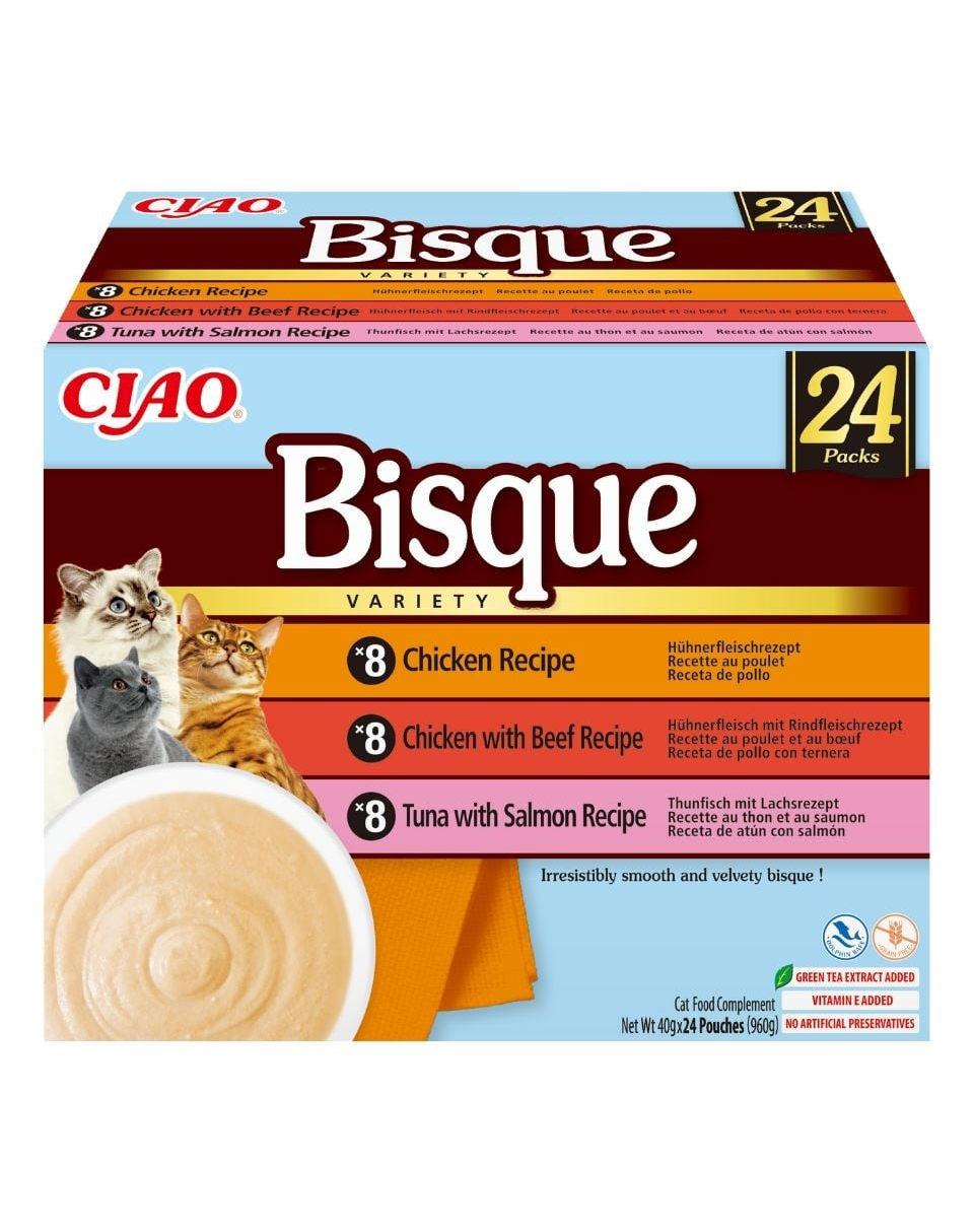 INABA Ciao Bisque Variety într-un set mare de 24×40 g este o propunere economică pentru pisicile care adoră mesele cremoase și aromate. Consistența mătăsoasă „bisque” combinată cu gustul delicat de pui, vită și pește și creează o hrană complementară excepțional de gustoasă și ușor digerabilă.