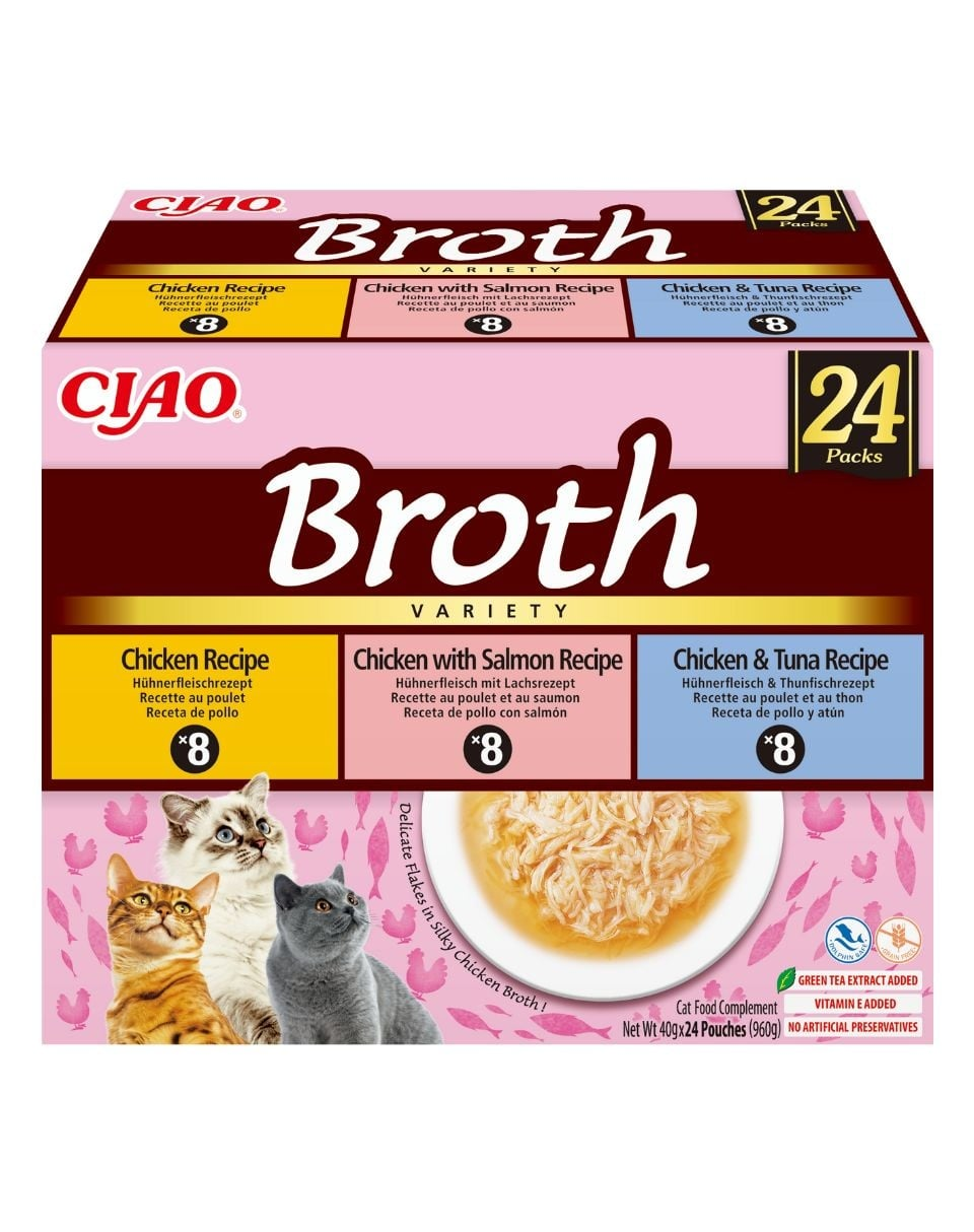 INABA Ciao Broth Variety este o hrană complementară ușoară și aromată pentru pisici, realizată din bucățele delicate de carne în bulion clar și natural. Varianta „Variety” include o selecție de arome: pui, ton și somon satisfăcând chiar și cele mai pretențioase gusturi.