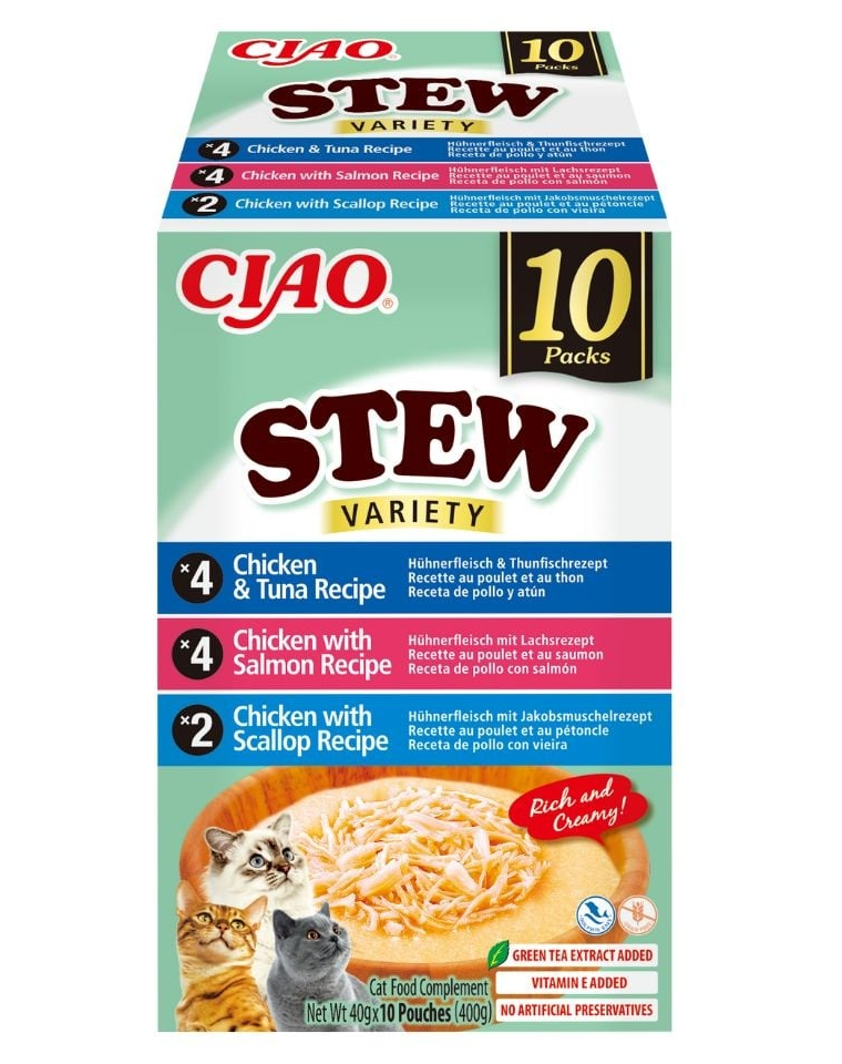 INABA Cat Ciao Stew Creamy Variety este o hrană complementară pentru pisici, extrem de gustoasă și cremoasă. Bucățelele delicate de carne și pește sunt scufundate într-un sos catifelat, formând o gustare ușoară, dar intens aromată. Setul conține un mix de trei variante, Pui, Pește și Scoici, care permite diversificarea zilnică a dietei pisicii.