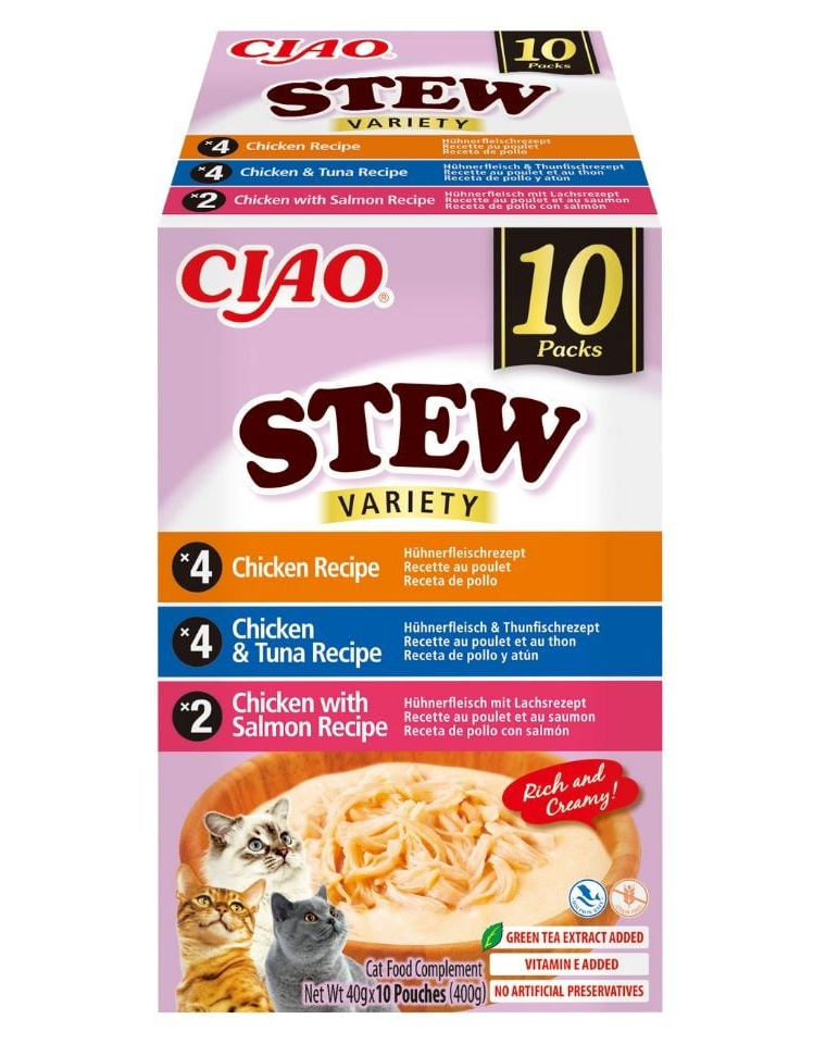 INABA Cat Ciao Stew Creamy Variety este o hrană complementară gustoasă și ușoară pentru pisici, sub formă de bucățele fine de carne, scăldate într-un sos dens, aromat, tip „stew”. Pachetul conține un mix de trei variante – cu pui, ton și somon – fiind ideal pentru pisicile mofturoase sau pentru diversificarea dietei zilnice.