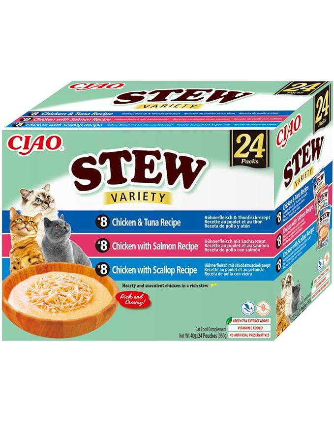 INABA Cat Ciao Stew Creamy Variety este o hrană complementară pentru pisici, extrem de gustoasă și cremoasă. Bucățelele delicate de carne și pește sunt scufundate într-un sos catifelat, formând o gustare ușoară, dar intens aromată. Setul conține un mix de trei variante, Pui, Pește și Scoici, care permite diversificarea zilnică a dietei pisicii.