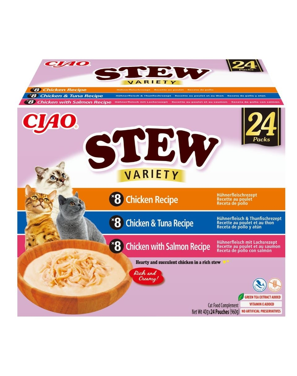 INABA Ciao Stew Creamy Variety 24×40 g este un set economic de hrană complementară ușoară, semilichidă, sub formă de tocăniță fină, cremoasă și suculentă cu pui, ton și somon. Consistența mai densă decât cea a bulionului, împreună cu aroma intensă, face produsul extrem de atractiv chiar și pentru pisicile foarte mofturoase.