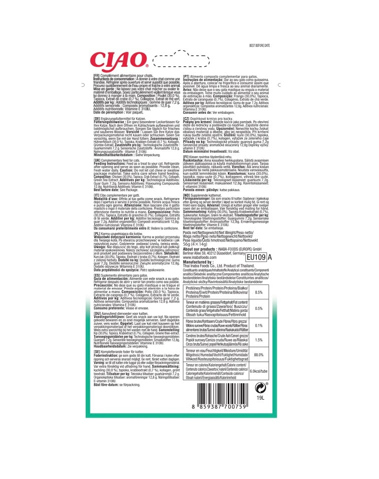 Pui (30.0%), tapioca, extract de crab (0.7%), colagen, extract de ceai verde