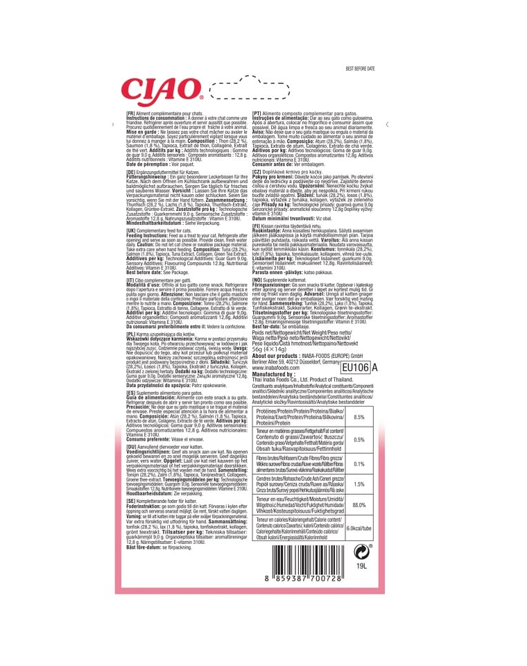 Ton (28,2%), somon (1,8%), tapioca, extract de ton, colagen, extract de ceai verde.