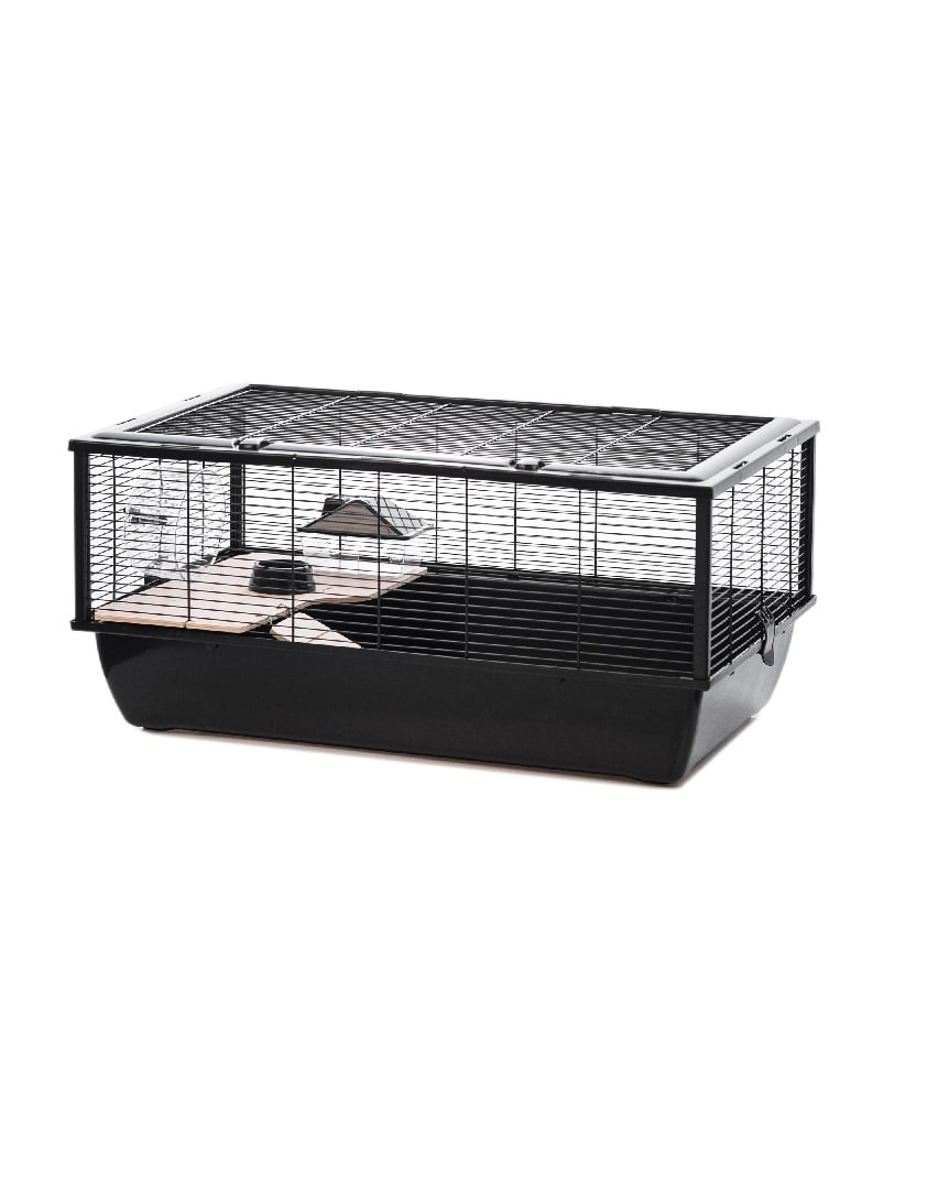 Cușca include o rotiță, un bol și o căsuță din plastic.