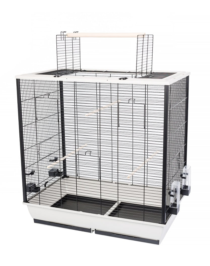 Cușcă pentru păsări. Echipată cu 4 hrănitoare mari și 4 stinghii, care sunt o parte esențială a unei colivii pentru păsări. Acestea permit odihna și joacă și pot oferi, de asemenea, un loc pentru a atașa o jucărie sau un accesoriu pentru păsări. Un avantaj al coliviei este tăvița adâncă pentru litieră, cu două sertare, care facilitează eliminarea deșeurilor și curățarea tăvii.