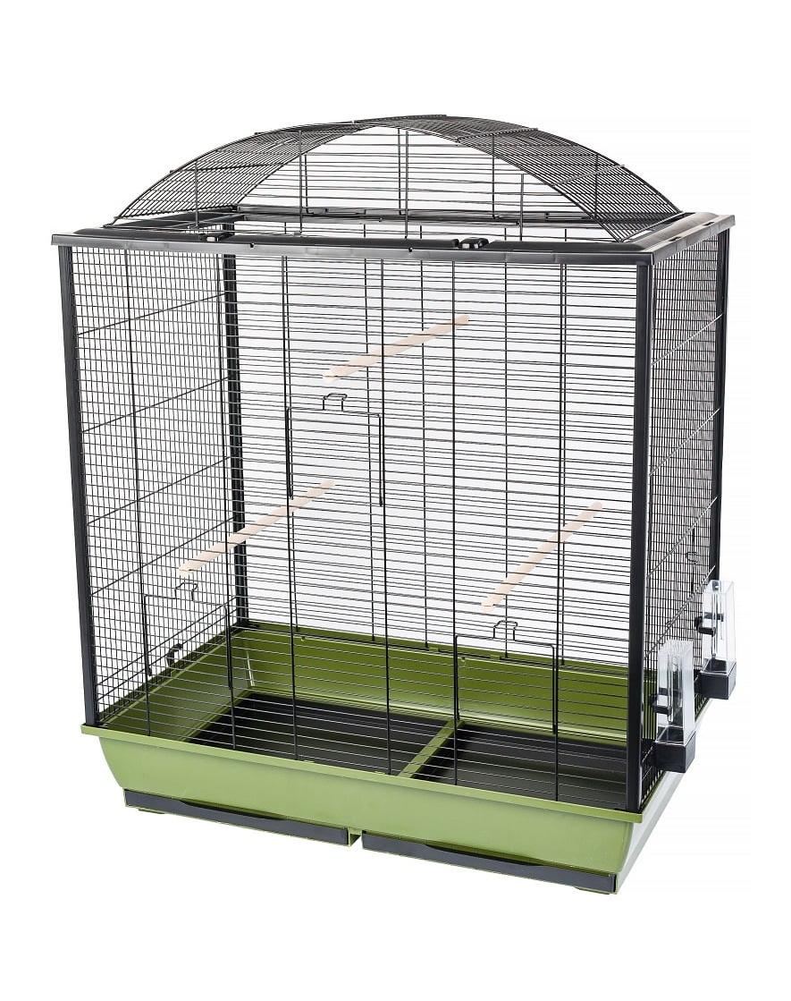 Cușcă cu acoperiș rotunjit pentru păsări. Cușca este foarte plăcută din punct de vedere estetic, potrivindu-se în orice interior. Cușca este echipată cu 2 hrănitori mari și 3 bețe care permit păsărilor să se odihnească sau să se joace și poate fi folosită și ca loc de fixare a jucăriilor sau accesoriilor pentru păsări. Amplasarea hrănitoarelor a fost ajustată pentru ca păsările să zboare în mod optim și să țopăie din loc în loc.