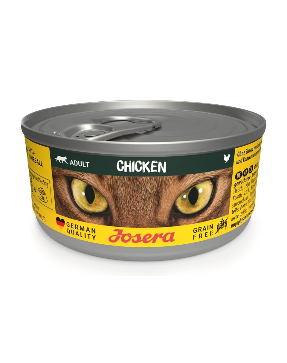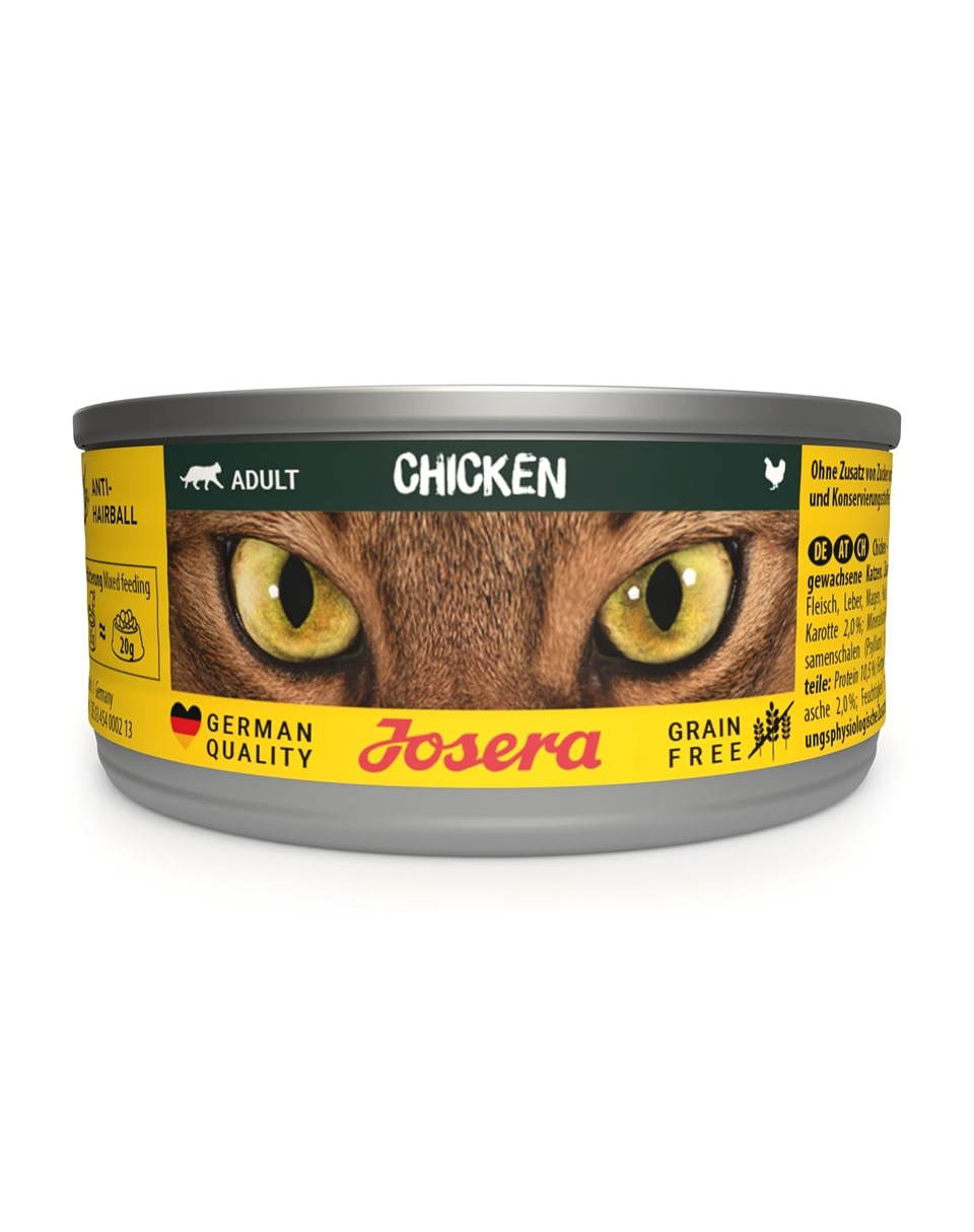 Hrană umedă completă pentru pisici adulte. JOSERA Adult Chicken este o hrană umedă completă pentru pisici adulte, cu pui, formulată fără cereale. Rețeta oferă un aport echilibrat de proteine animale și nutrienți esențiali, fiind potrivită ca aliment principal zilnic.