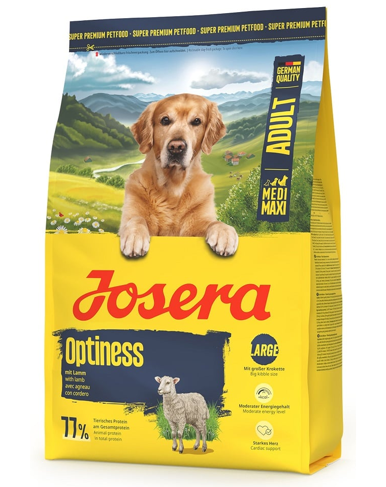 Josera Optiness este o hrană completă, echilibrată, concepută pentru câinii adulți de talie medie și mare, cu un nivel normal de activitate. Rețeta bazată pe miel bine tolerat și orez ușor digerabil nu conține porumb, soia sau grâu, ceea ce o face potrivită și pentru câinii cu sensibilități digestive.