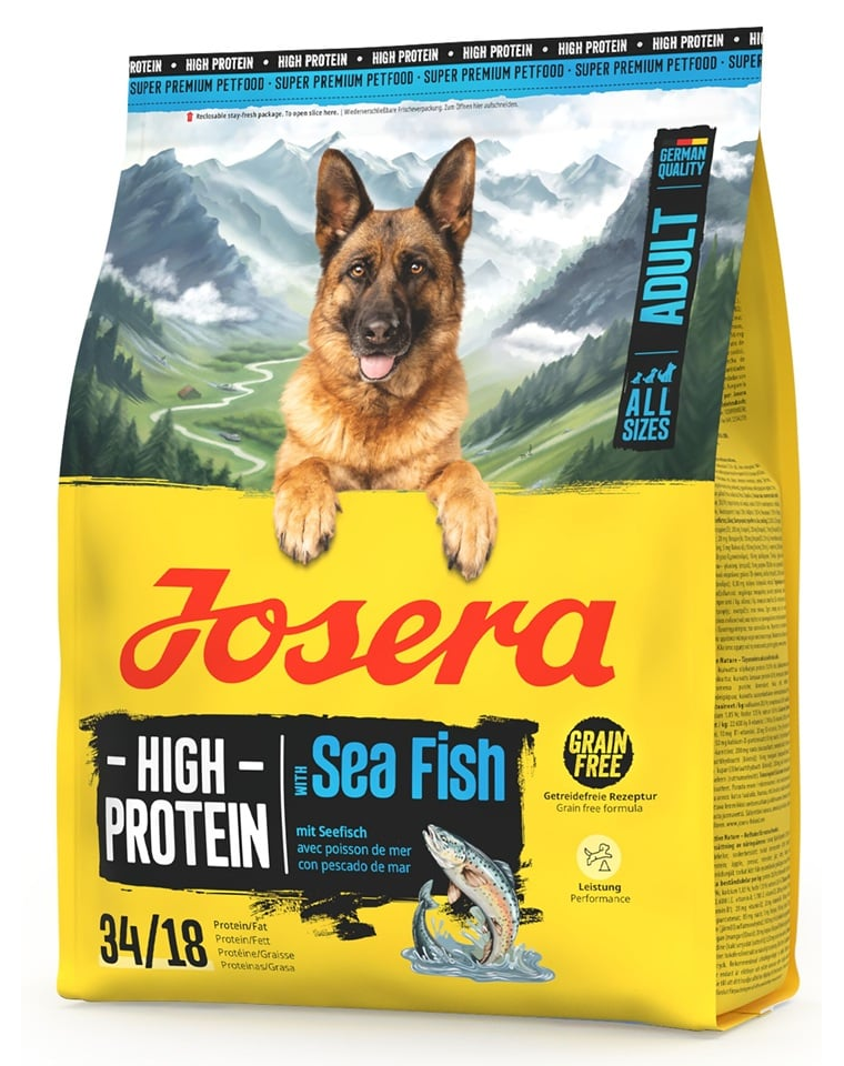 JOSERA High Protein Adult Sea Fish – hrană naturală, fără cereale, special concepută pentru câinii activi care au nevoie de performanță, forță și vitalitate zilnică.