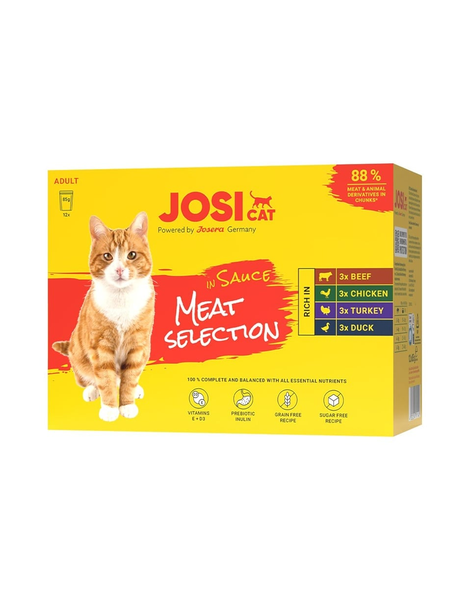 Hrană umedă completă pentru pisici adulte. JOSERA JosiCat Meat Selection in Sauce este o hrană umedă completă pentru pisici adulte, care oferă patru rețete cu carne, în bucăți suculente în sos. Multipack-ul este conceput pentru a asigura varietate zilnică și palatabilitate ridicată, menținând în același timp un profil nutrițional echilibrat.