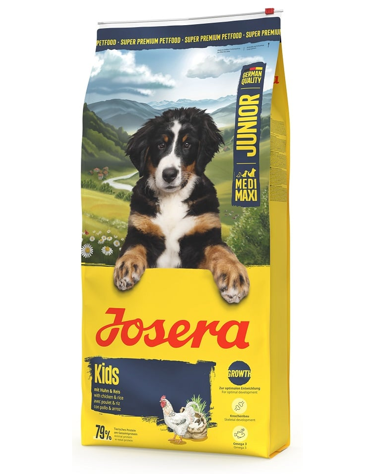 JOSERA Junior Kids este o hrană completă și echilibrată, fără gluten, concepută pentru câinii tineri de rase medii și mari, aflați în faza de creștere intensivă. Rețeta cu pui delicat și orez ușor digerabil asigură aportul optim de proteine, energie și minerale, sprijinind dezvoltarea armonioasă a mușchilor, oaselor și articulațiilor.