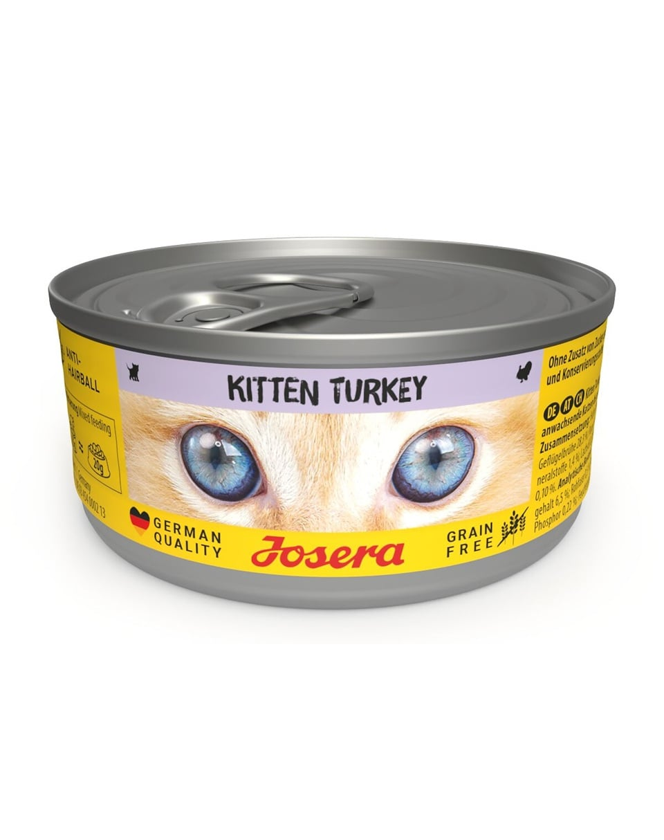 Hrană umedă completă pentru pui de pisică, până la 12 luni. JOSERA Kitten Turkey este o hrană umedă completă, formulată special pentru puii de pisică în primul an de viață. Rețeta conține 70% carne de curcan și pui, completată cu bulion de pasăre, oferind un gust intens și o digestibilitate ridicată.