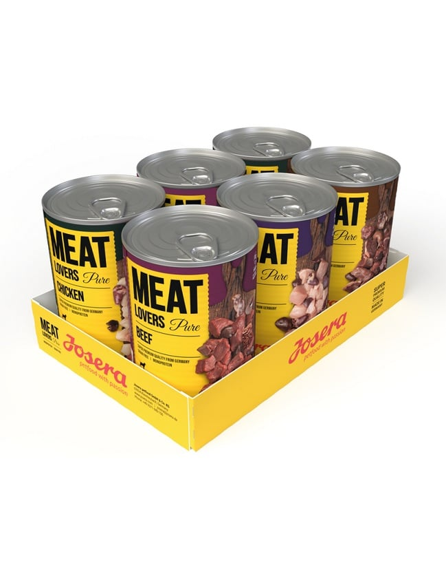 Josera Meat Lovers Pure Multipack este alegerea ideală pentru câinii care iubesc adevăratele arome de carne. Fiecare conservă conține 68% carne, fără adaosuri inutile – doar nutriție naturală și gustoasă.