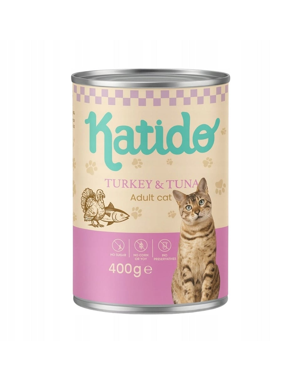 KATIDO Adult Cat Turkey & Tuna este o hrană umedă completă pentru pisici adulte, concepută pentru o alimentație zilnică ușor digerabilă, dar nutritivă. Combinația de curcan (50%) și ton (20%) asigură o palatabilitate ridicată și proteine complete, susținând mușchii pisicii și energia zilnică.