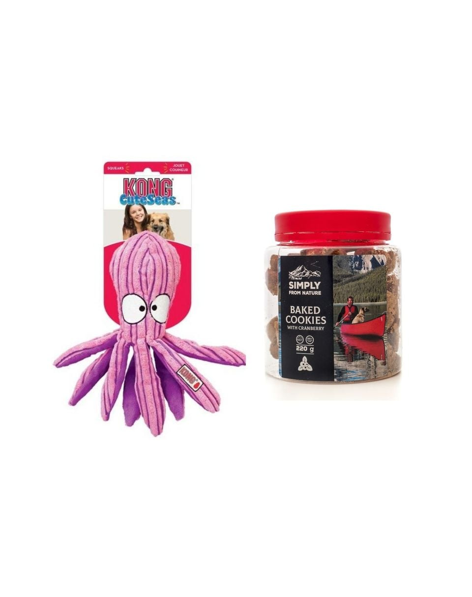O jucărie pentru câini, de pluș sub formă de caracatiță din catifea cu o țeavă cusută și folie foșnitoare.