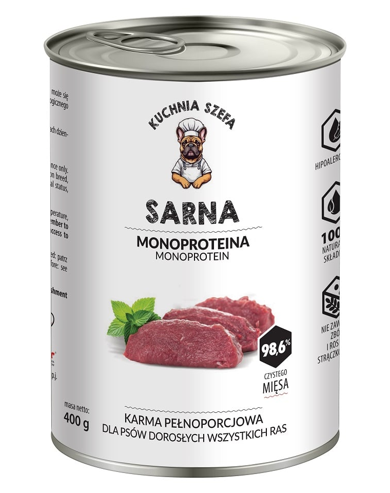Kuchnia Szefa Monoproteică cu carne de căprioară este o hrană umedă completă, bogată în carne, creată pentru câinii adulți de toate rasele. Cu un conținut impresionant de 98,6% carne de căprioară, produsul oferă proteine de înaltă calitate, ușor digerabile, și o sursă naturală de vitamine și minerale. Formula monoproteică o face ideală pentru câinii cu alergii alimentare sau sistem digestiv sensibil.