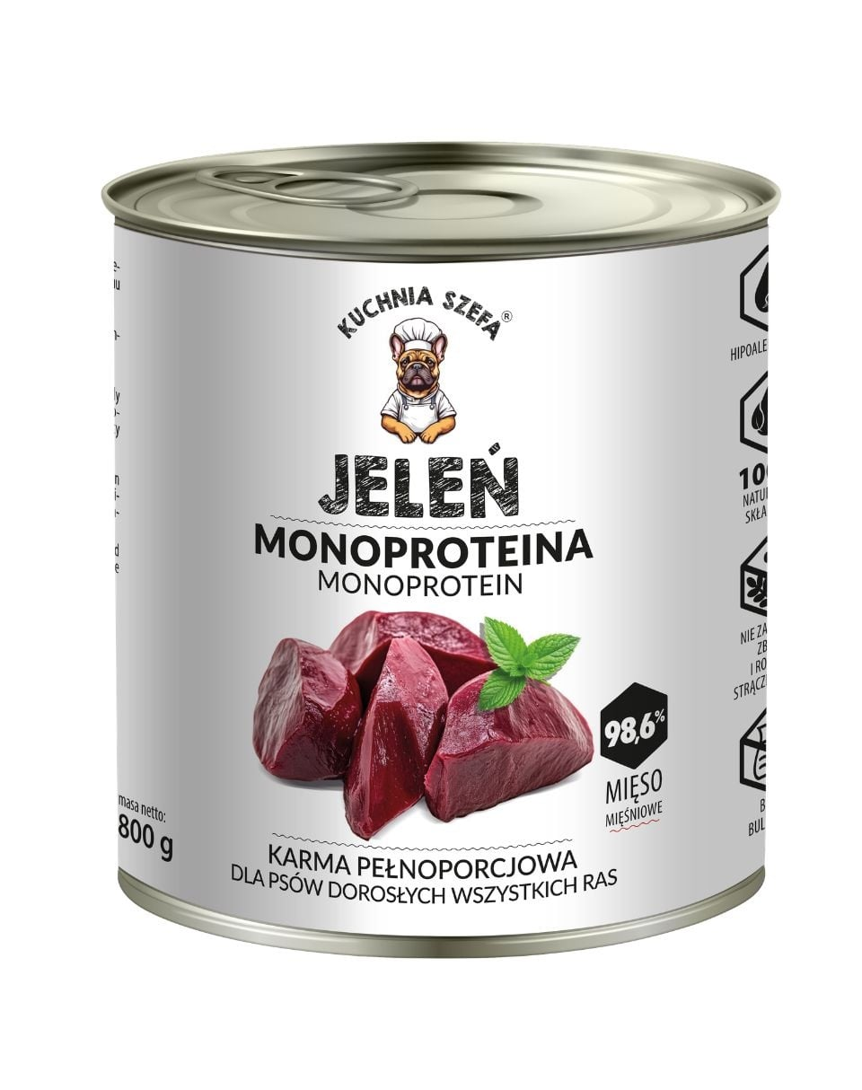 Hrană umedă monoproteică cu carne de cerb pentru câini. KUCHNIA SZEFA Monoproteină Cerb este o hrană umedă completă pentru câini, formulată pe baza unei singure surse de proteină animală – carne de cerb. Rețeta este concepută pentru câinii cu sensibilitate digestivă sau alergii alimentare, dar poate fi utilizată și în alimentația zilnică a câinilor adulți.
